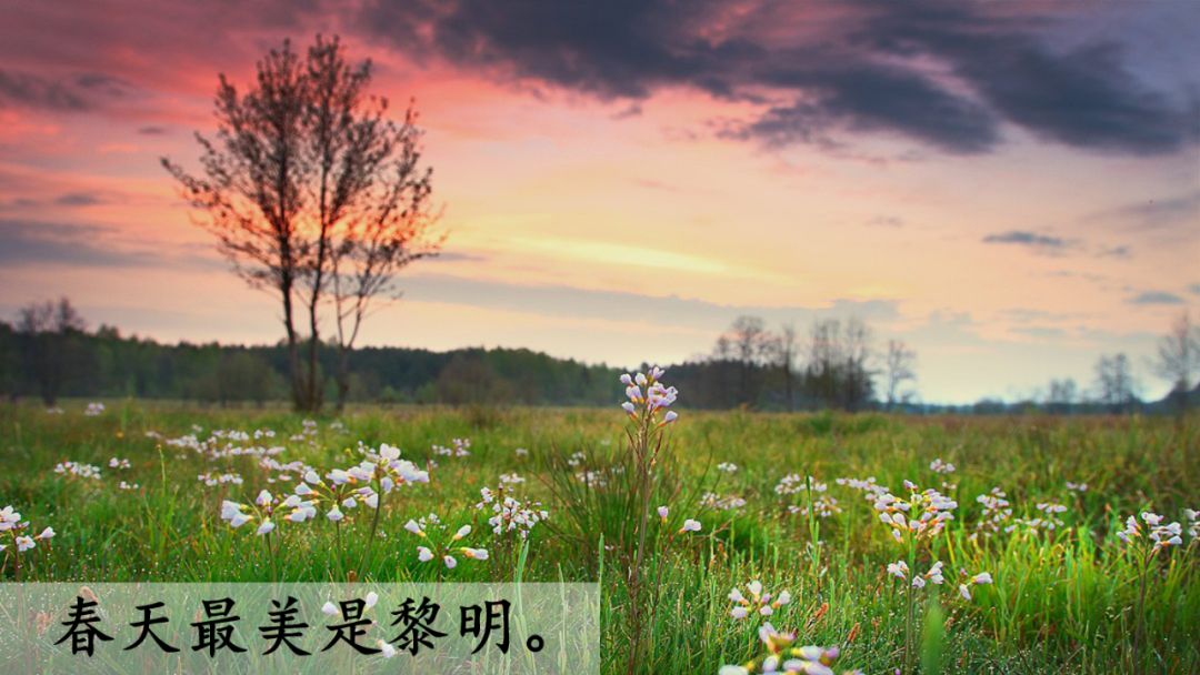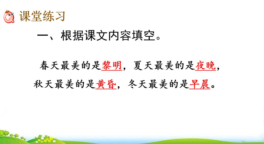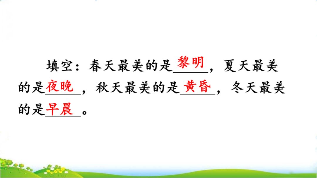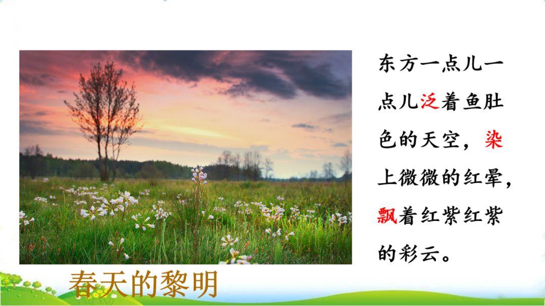 答:春天,最美的时间是黎明,最美的景物有鱼肚色的天空、彩云。