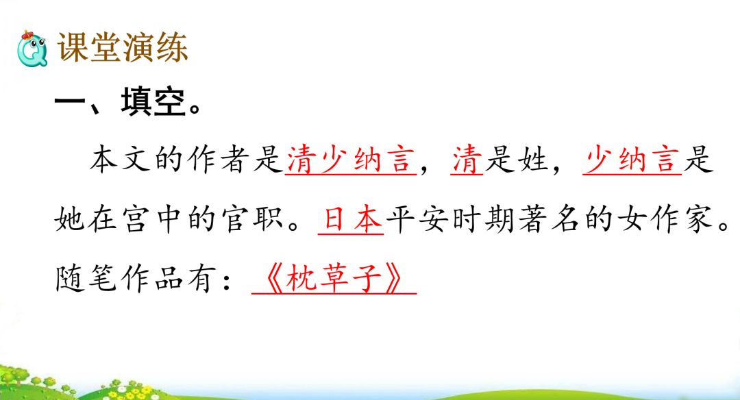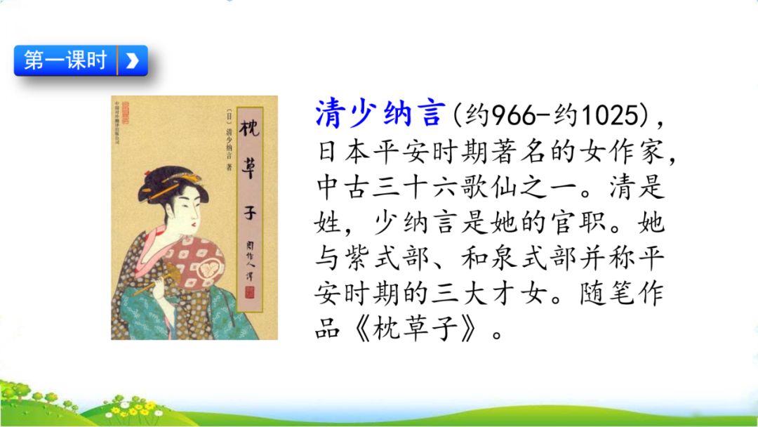 本文作者从自己的主观感受出发,对四季之美进行了列举:春天的黎明、夏天的夜晚、秋天的黄昏、冬天的早晨。作者细致描写自然界中出现的各具特色的景物,从而赞美四季的美,表现了对生活及大自然的热爱。