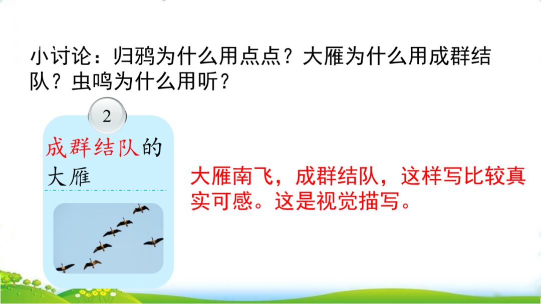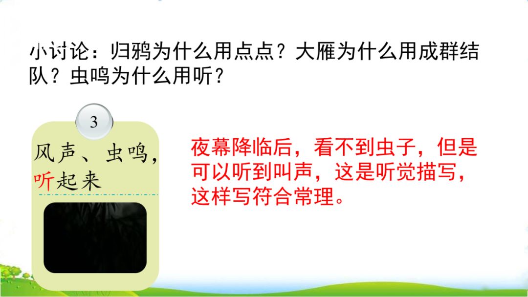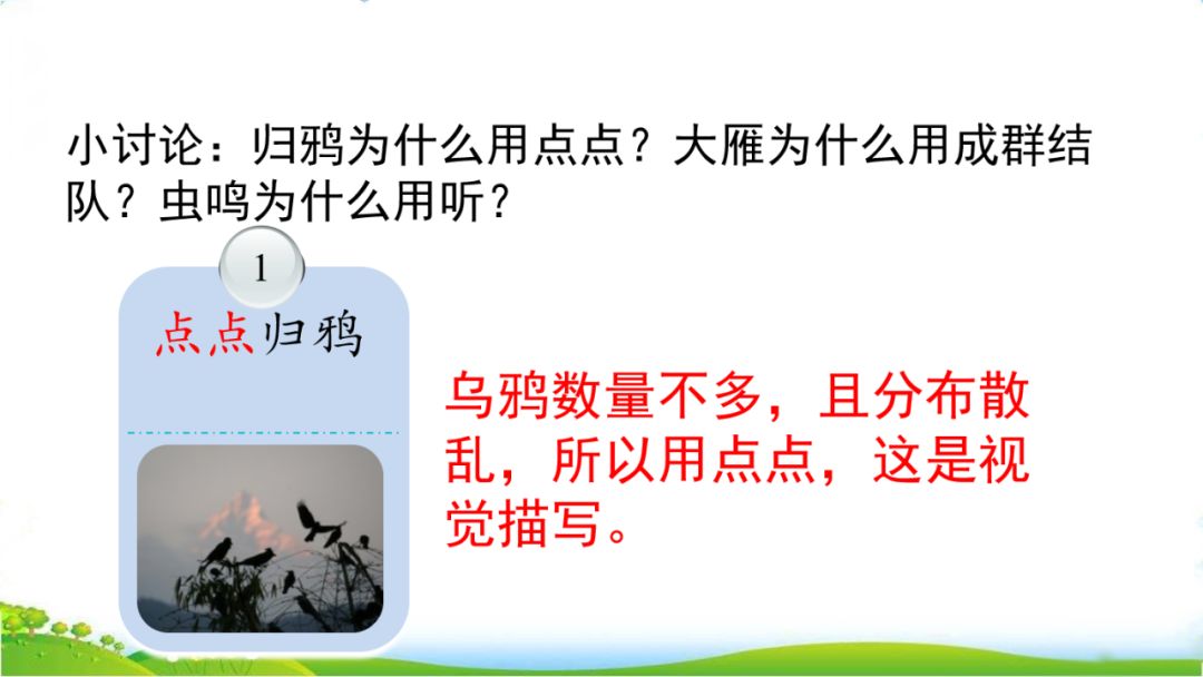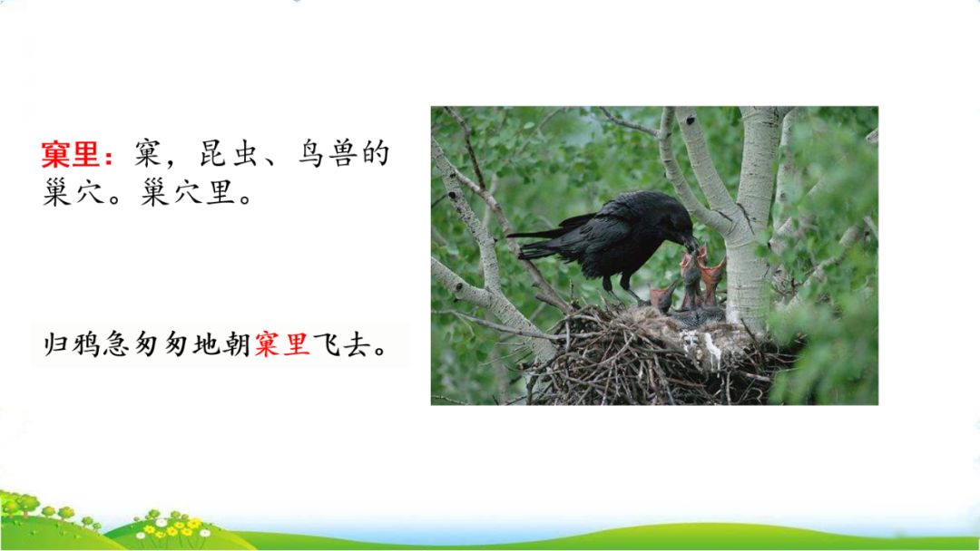 (2)夕阳斜照西山时,动人的是点点归鸦急急匆匆地朝窠里飞去。