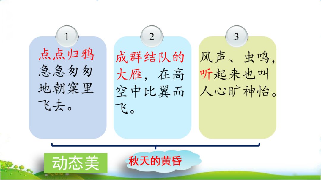 这三句话都是动态描写。第一句话描写了萤火虫在夜晚的细雨中飞行的情景,用“迷人”一词进行修饰,展现出萤火虫飞行的情态之美。第二句话描写乌鸦归窠,乌鸦数量不多,且分布散乱,所以用点点,这是视觉描写,突出“动人”。第三句话描写大雁南飞,成群结队,比较真实可感,点出其让人“感动”。这些动态的景物描绘,赋予景物以运动感、活力感、变化感,使景物栩栩如生,具有很强的感染力。