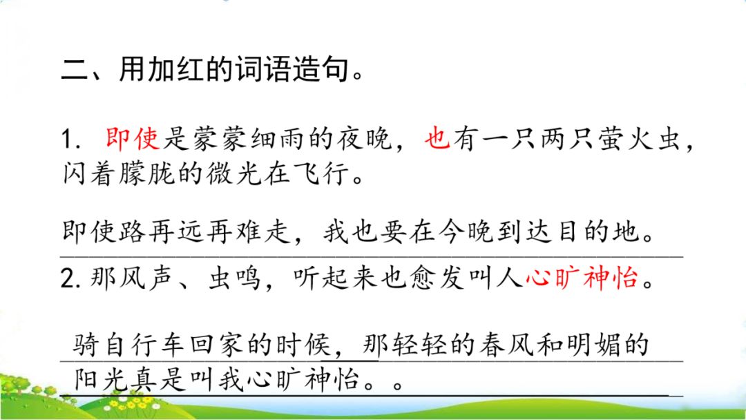 (1)即使是蒙蒙细雨的夜晚,也有一只两只萤火虫,闪着朦胧的微光在飞行,这情景着实迷人。