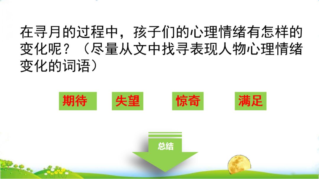 本文通过记叙一场有情趣的寻月活动,展现了月的神秘与美好,赞扬了孩子们美丽纯洁的心灵,表达了孩子们追求美好事物的纯真愿望。同时告诉人们:对光明、美好的事物,只要执着努力地追求,人人都能拥有。