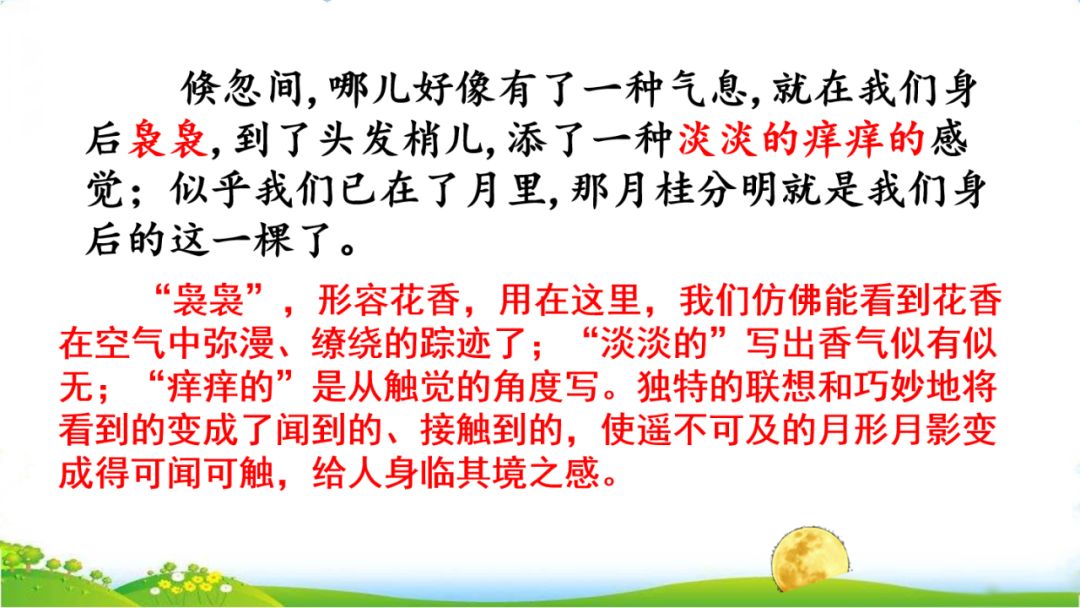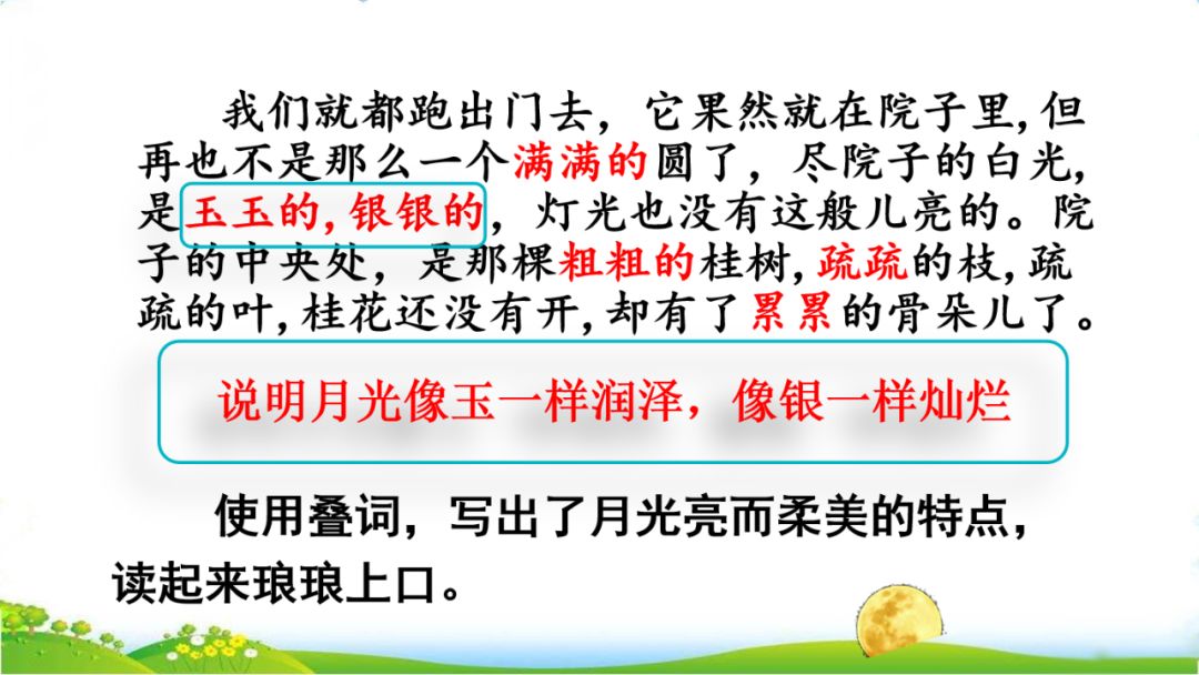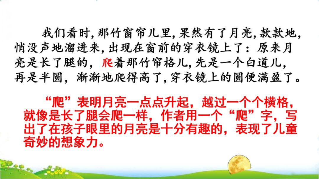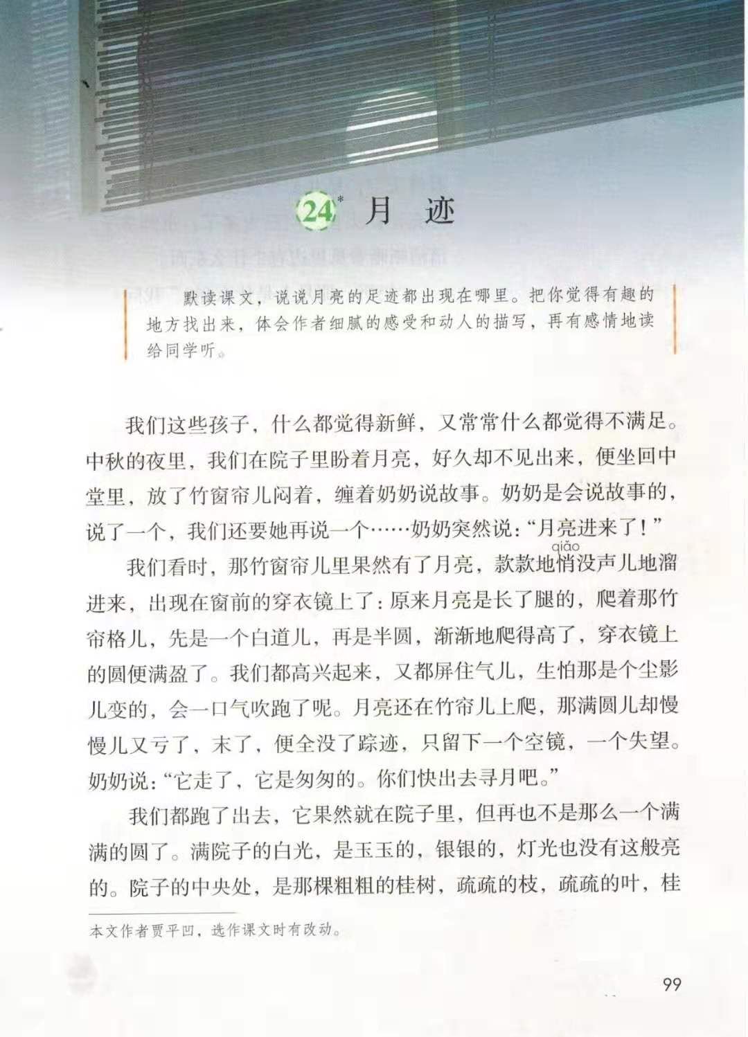 答:月亮的足迹出现在:竹窗帘儿里、穿衣镜上、院子里、葡萄叶儿上、瓷花盆儿上、爷爷的锨刃儿上、河水里、弟弟妹妹的眼睛里、“我”的眼睛里。
