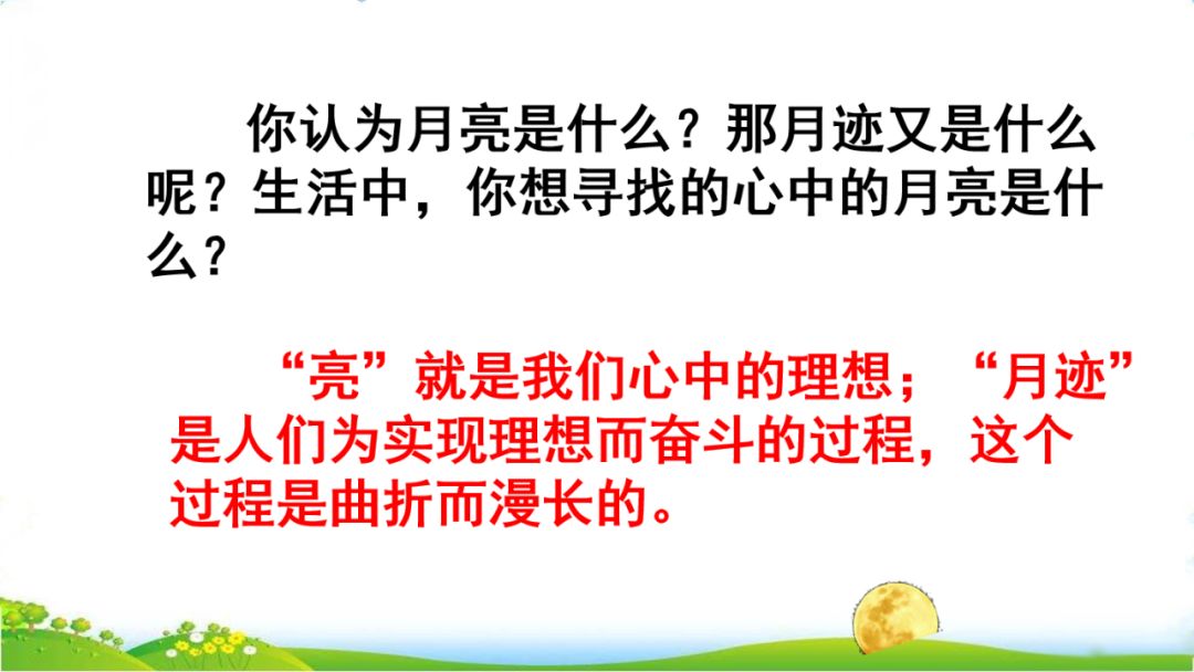 答:文中的月亮象征着一切美好的事物。作者含蓄地告诉人们:对光明、美好的事物,只要执着努力地追求,人人都能拥有。