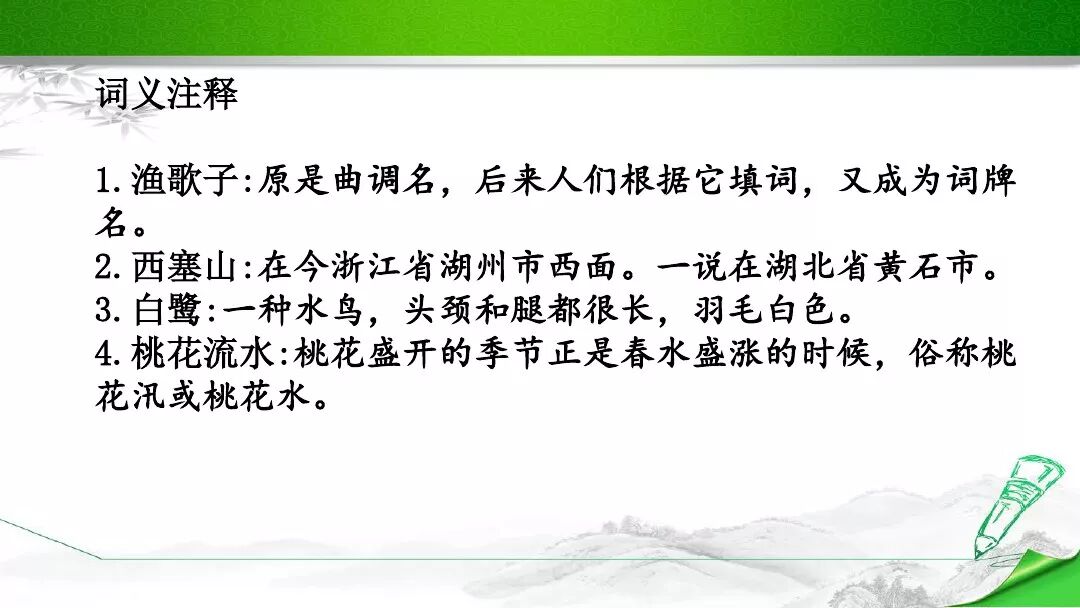 词的首句中“西塞山前”点名地点,“白鹭”是闲适的象征,白鹭自在地飞翔衬托出渔父的悠闲自得。次句意思是说:桃花盛开,江水猛涨,这时节鳜鱼长得正肥。这里桃红与水绿相映,表现出暮春时节西塞山前的湖光山色,渲染了渔父的生活环境。三、四句描写了渔父捕鱼的情态。渔父戴着箬笠,穿绿蓑衣,在微风细雨中乐而忘归。全诗着色明丽,用语活泼,生动地表现了渔父悠闲自在的生活。