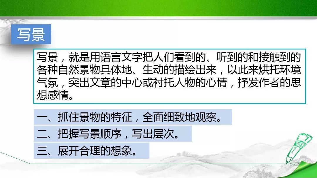 动态描写:它与静态描写的根本不同,就在于它是按照时间将景物的活动、变化、姿态、声响描绘出来。它适用于表现紧张、热烈、欢快、烦躁、不安等气氛与情调之描写。