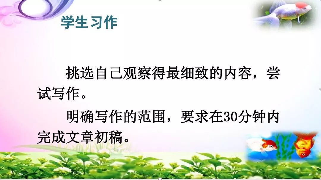 2.按照一定的顺序描写。在写作时,一般来讲,写一种自然现象,可以按时间顺序来写,如写“观日出”,可按日出前、日出时、日出后的顺序来写;写一处自然景观,可按空间顺序来写,如“窗外即景”可按由远及近的顺序来写。
