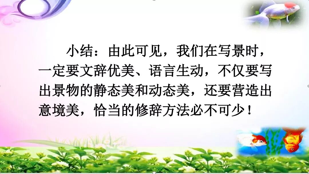 3.抓住变化,展示形态。任何一种自然景物,都不是静止不动的,它每时每刻都处于运动变化之中。因此,我们在描写时,一定要抓住它的形态变化,这样写出来的景才会活泼生动,使人有身临其境之感。