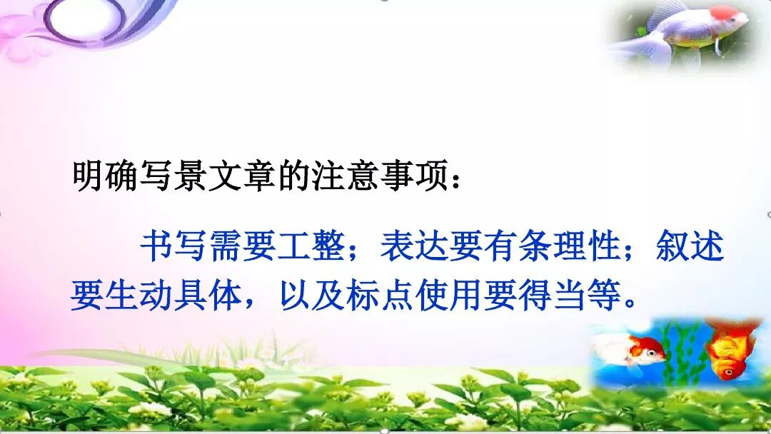 1.抓住特点,仔细观察。大自然中的自然现象和自然景观形形色色,千姿百态,只有仔细观察,才能抓住它们的特点,才能把景象写得真实,给人如临其境的感觉。所以同学们在确定好描写对象之后,一定要认真观察,切实把握景物特点。