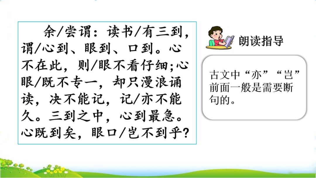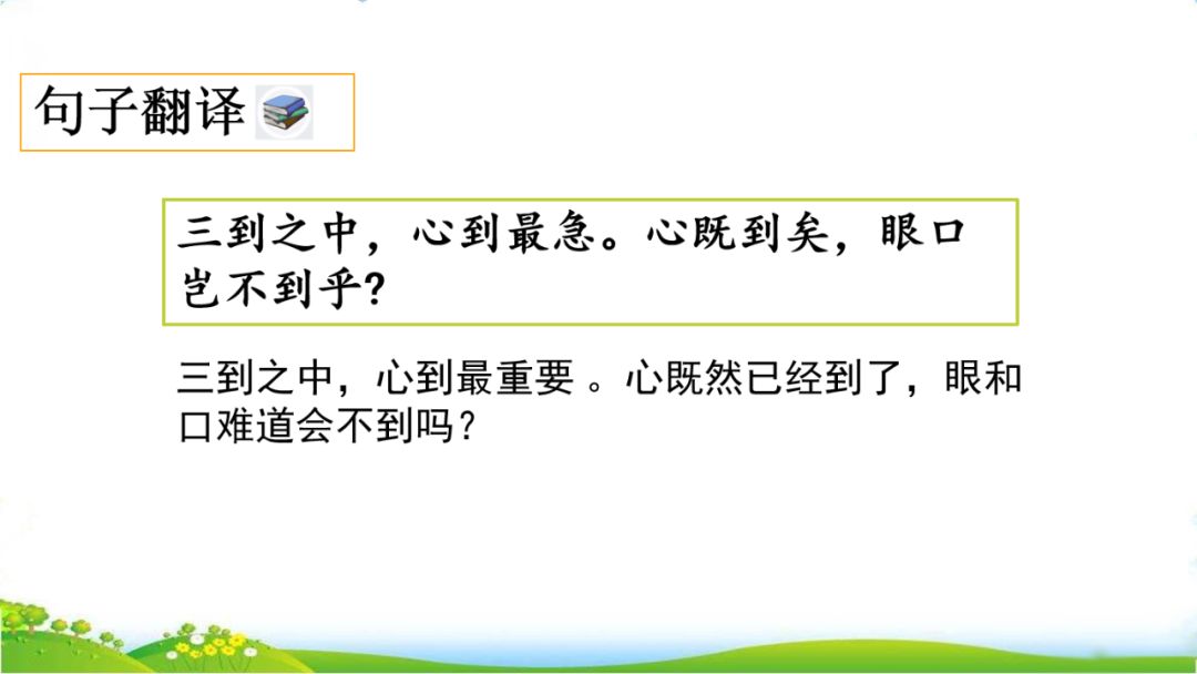 余尝谓;读书有三到,谓心到,眼到,口到。心不在此,则眼不看仔细,心眼既不专一,却只漫浪诵读,决不能记,记亦不能久也。三到之中,心到最急。心既到矣,眼口岂不到乎?