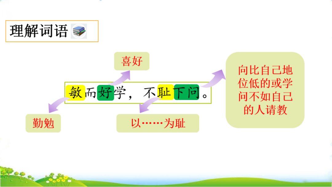 ①敏:勤勉。②好:喜好。③耻:以……为耻。④下问:向比自己地位低或不如自己的人请教。知:同“智”,智慧。⑥识:记住,这里读zhi。⑦厌:满足。⑧诲:教诲。