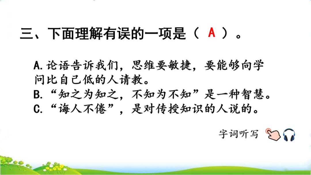 A、勤勉而喜好学习,不以向比自己地位低或不如自己的人请教为耻。知道就是知道,不知道就是不知道,这才是真智慧啊。将知识默记在心,学习时不感到满足,教诲人不感到疲倦。
