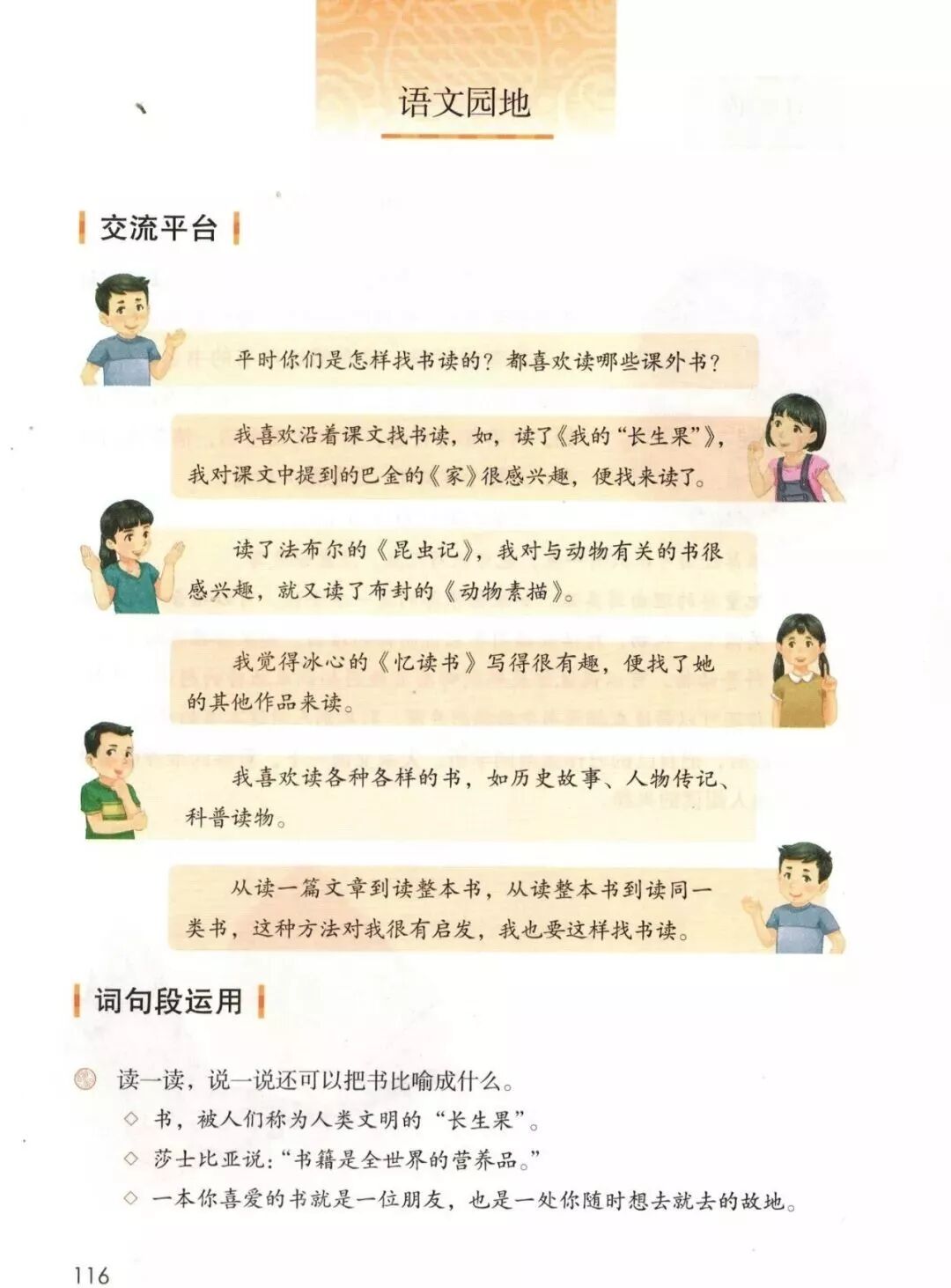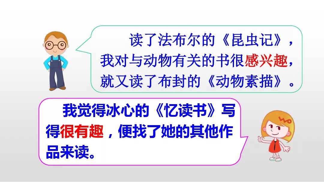 读了五个小朋友说的话,我发现他们在谈论找书读的方法。第一个小朋友问大家平时是怎样找书读的,喜欢读什么书。其他小朋友谈了自己找书读的方法:沿着课文找书读;读同一类的书;读同一作者写的不同的书;读各种各样的书。第一个小朋友从中受到启发:从读一篇文章到读整本书,从读整本书到读同一类书。