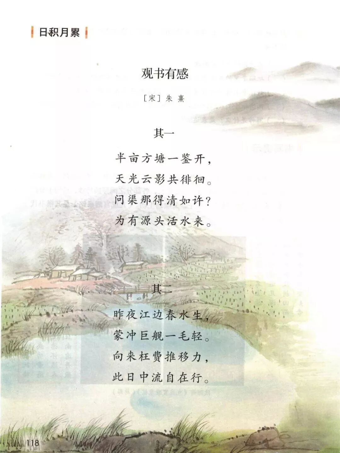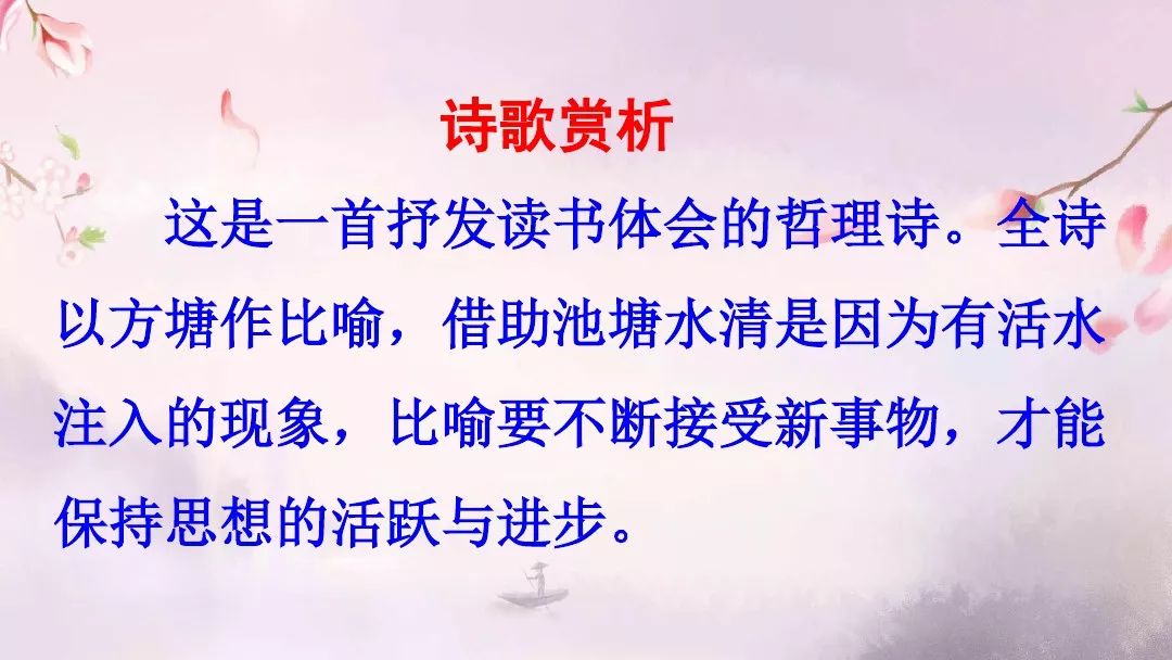 第一首诗借方塘形象地抒写自己的读书体会。诗人先描绘了池塘像镜子一样澄澈明净,天光云影在水中来回移动的美好景象。然后笔锋一转,发出自己的疑问,天光云影的美景从何而来呢?是因为水清澈才得以呈现。而水为什么会这么清澈呢?因为有活水不断从源头流过来。诗人以源头活水作比,揭示了只有不断汲取营养,获取新知,才能豁然开朗,融会贯通的道理。