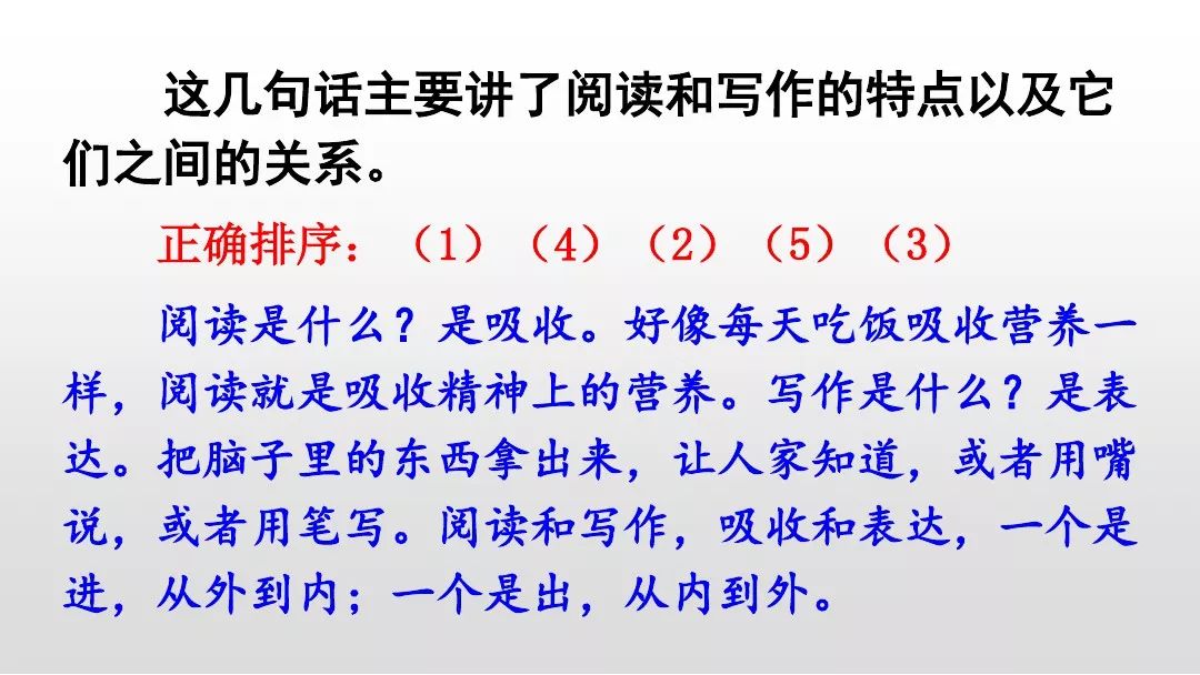 ( 5 )阅读和写作,吸收和表达,一个是进,从外到内;一个是出,从内到外。