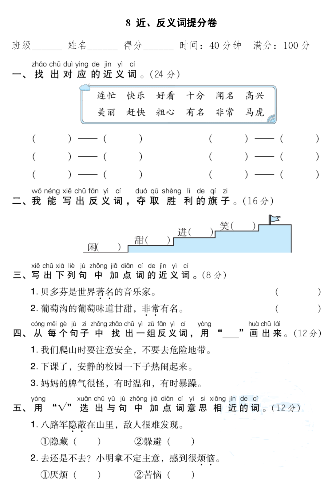 教研室的老师,今天给大家整理了《期末专项复习 | 统编语文二年级(上)近、反义词专项复习,可下载》请各位家长打印给孩子练练,更扎实的巩固全册知识点!