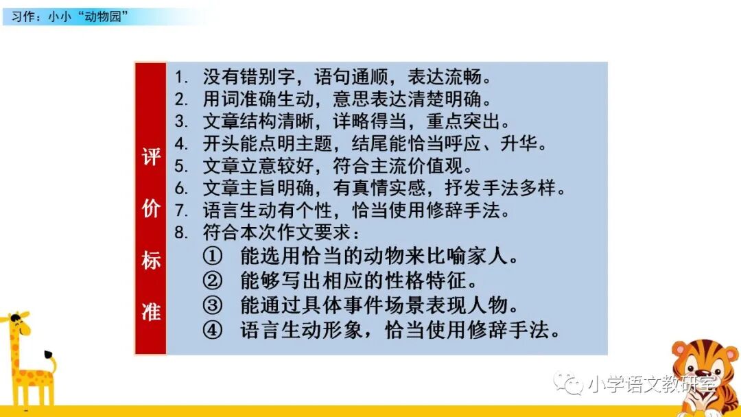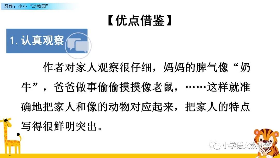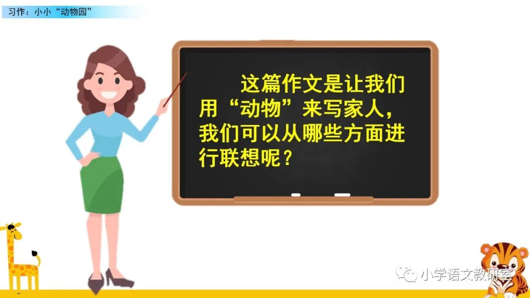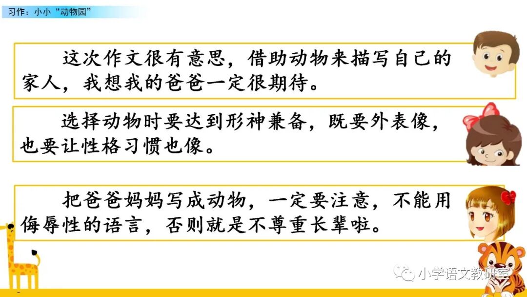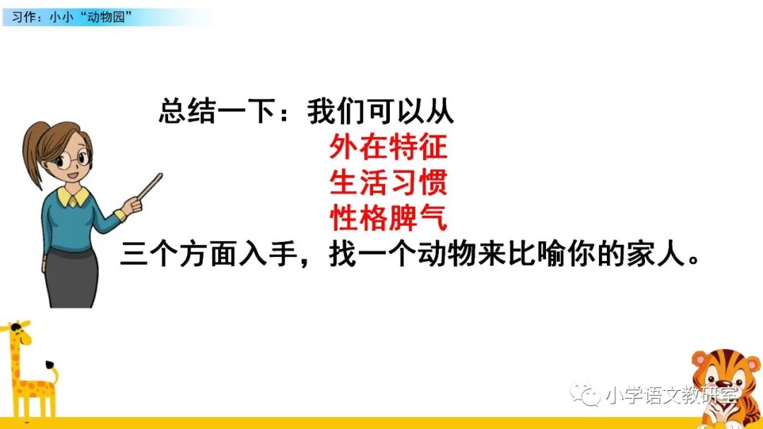 想一想你的家人和哪些动物相像,然后给家里的每个人都写上一段话。1.抓住人物的特点,恰当运用外貌、动作、神态等描写方法。2.找出家人和动物之间的相似点,比喻要形象、恰当。