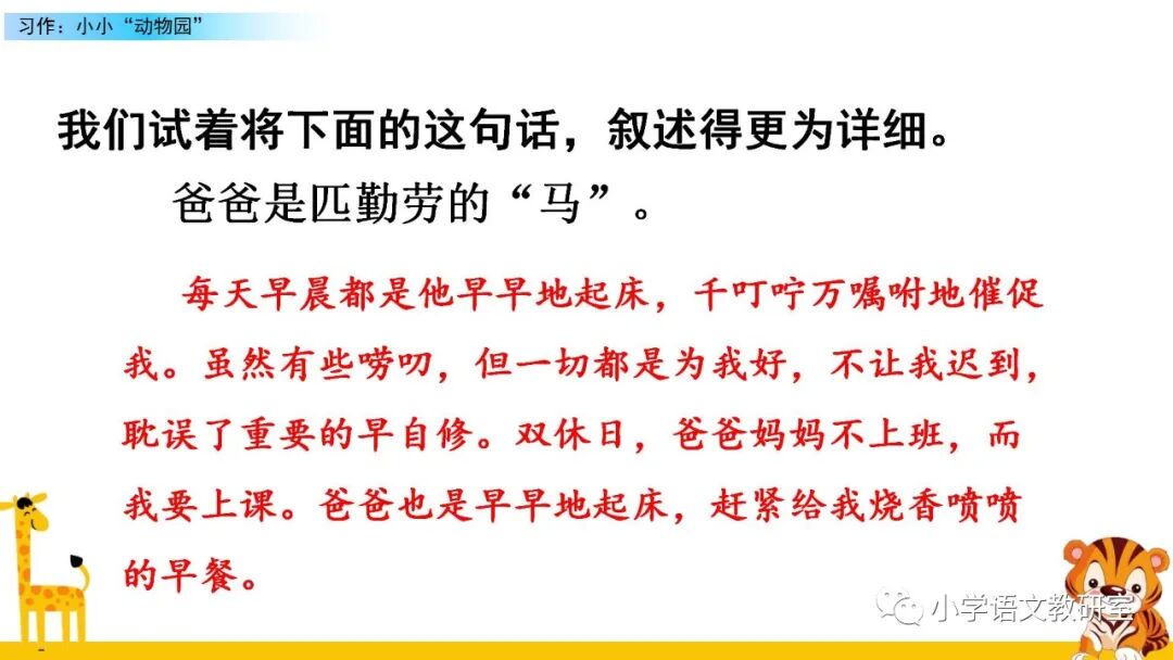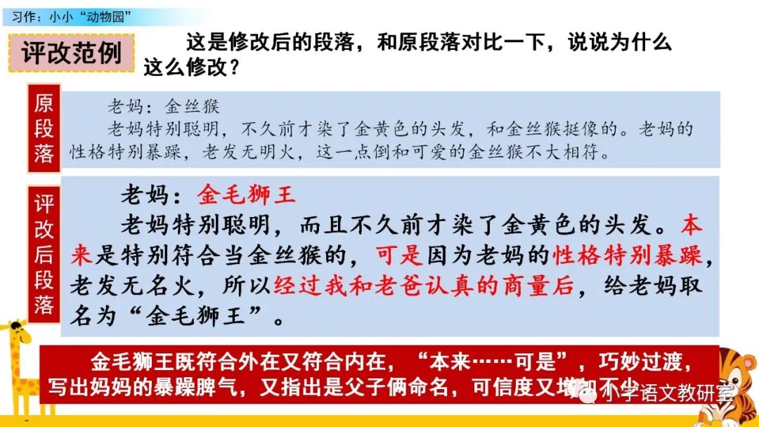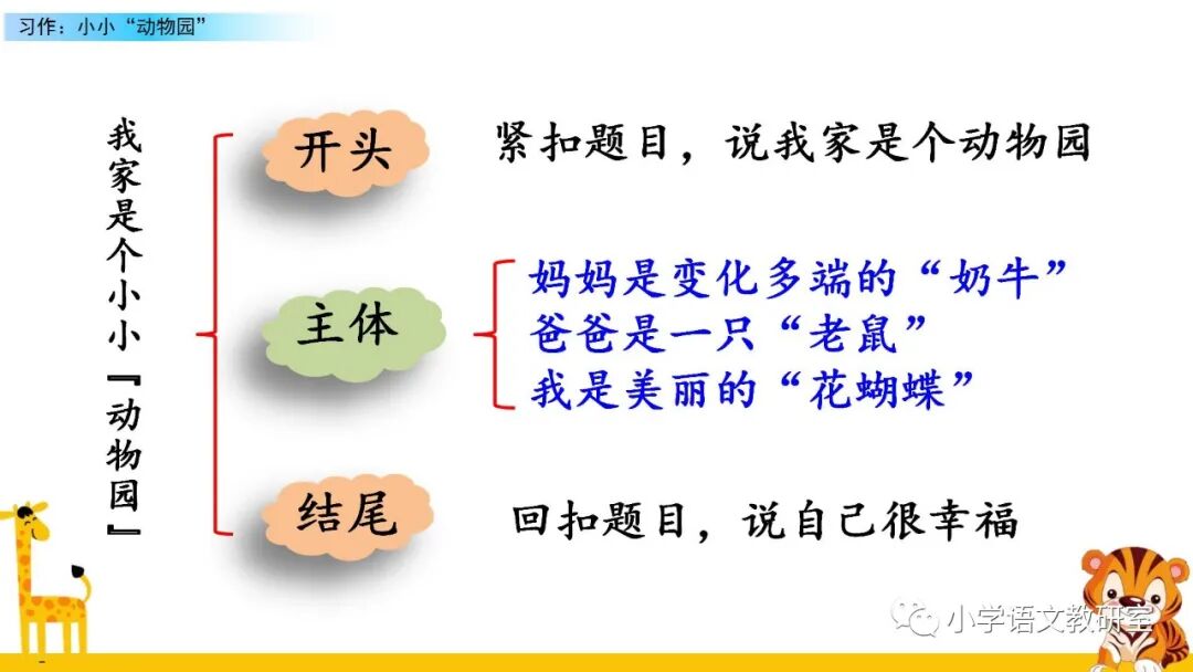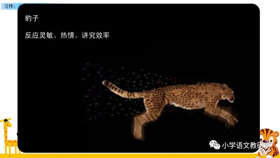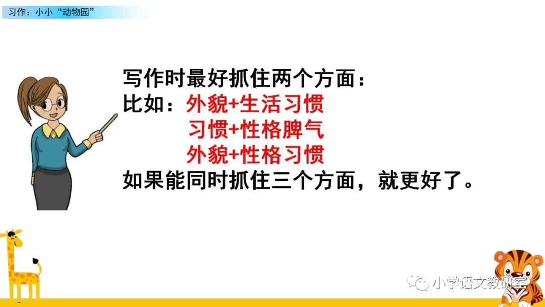 想一想你的家人和哪些动物相像,然后给家里的每个人都写上一段话。1.抓住人物的特点,恰当运用外貌、动作、神态等描写方法。2.找出家人和动物之间的相似点,比喻要形象、恰当。
