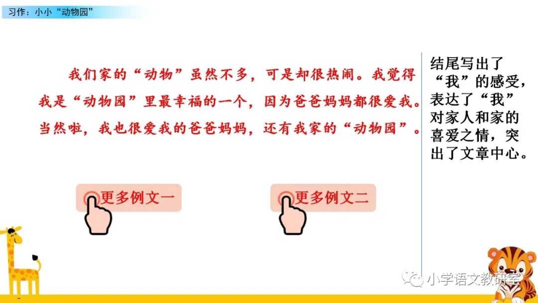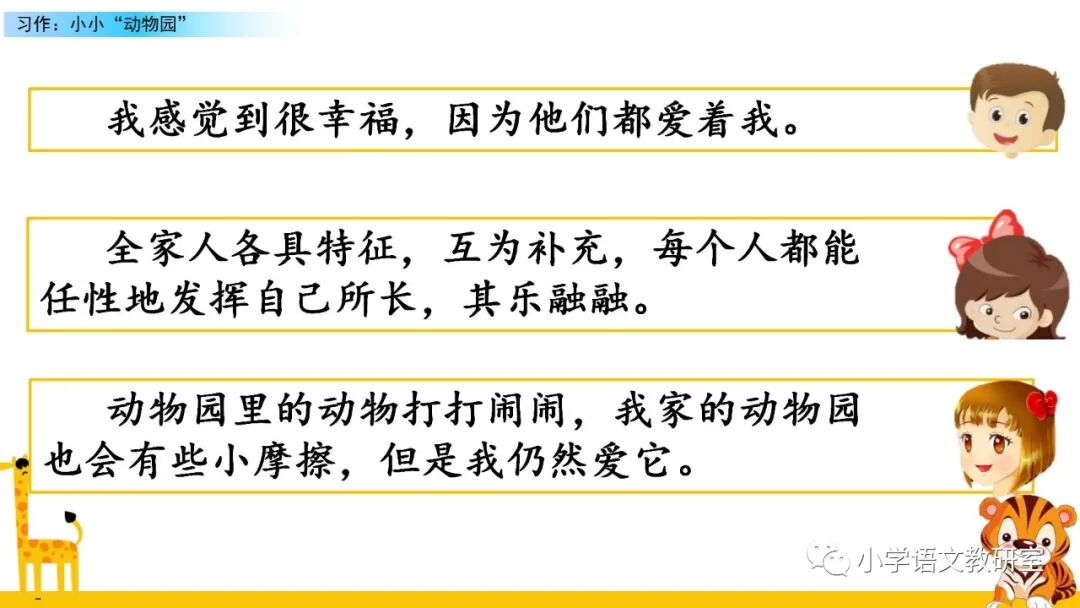 我的外婆是一只花孔雀。她身材高挑纤瘦,脖子细长,长相清秀,完全看不出是一位老太太。外婆每次出门前,都会穿上她亲手做的漂亮衣服,把自己打扮得光彩照人。她爱跳民族舞,每当她穿着美丽的长裙翩翩起舞的时候,就更像一只开了屏的花孔雀。外婆还爱逛街,爱逛商场,爱喝咖啡,爱吃西餐等等,她过着比年轻人还优雅、时尚的生活。我的外公就是一只公鸡。每天六点不到,天刚蒙蒙亮,就隐约听到厨房里传来“叮叮当当”的声音,那是外公在辛劳地帮我们做早饭呢。准备完早饭,他会在七点半准时喊我起床,如同公鸡打鸣。外公平常是个威严的人,走起路来总是双手放在背后,直着腰板,目光坚定有神,雄赳赳气昂昂,活脱脱的一副大公鸡的模样。再来说说我的妈妈,她是一只温柔体贴的猫。她圆圆的眼睛总是发出柔和的光,笑起来眼睛眯成了一条缝。妈妈会给我买很多我喜欢的书和零食,陪我聊天,陪我游戏,陪我学习。即使我犯了大错,妈妈也不忍心说一两句重话,她说我是她生命中的天使,就应当被她温柔以待。说起我的弟弟,那可绝对是一个不折不扣的小猴子。他爱吃桃子,每当有桃子出现在他眼前,两眼就发光,直勾勾地盯着桃子,忍不住吃上一口,并且吃了就停不下来了,直到吃完为止。他又是家里的“机灵鬼”,一天,我心血来潮,想看看弟弟的算术能力怎么样,于是我就问他:“11+7=?”他想都不想,就脱口而出:“等于18!”我继续问道:“18加24等于几?”“等于42!”他信心满满地回答。我觉得不可思议,他才上幼儿园就会这么难的题目了,真不愧是我们家的“机灵鬼”。我的弟弟不仅和猴子一样机灵,还和猴子一样很调皮,总是上蹿下跳的,时而在房间里连蹦带跳,时而在沙发上蹦蹦跳跳。上次吃午饭,他一直东动动西动动,吃了半小时也没吃好饭。在我们家,我可是一只小百灵鸟。整天在妈妈身边飞来飞去,叽叽喳喳的。一天,妈妈开车送我去学习,我在路上说个不停,妈妈说她听得耳朵都起茧子了。百灵鸟唱歌可好听了,我的歌声也很美妙哦!一次音乐课,老师请了我和其他七位同学来合唱,我们默契十足,当我们唱完教室里顿时响起了轰鸣般的掌声。老师还把我们八人成立了音乐团队呢!我的妈妈那可是一只母老虎,她虽然没有尖锐的牙齿,也不爱吃肉,但却非常凶。一次,我没洗澡就上床玩,妈妈看见了,大声吼道:“快下来!”只见妈妈竖起鬓毛,瞪大眼睛,吓得我连滚带爬下了床。我的妈妈真是一只凶猛的母老虎。点评:小作者用首尾呼应的写法,以动物园形容自己的家,生动而深刻。文章篇幅不长,但结构合理。街接紧凑,转承巧妙,能成为写人这类习作的典范。我家是个小小的“动物园”。你现在一定在想,家怎么会是动物园呢?且听我慢慢道来。清晨的第一缕阳光调皮地钻过窗帘,跃进房内。“呜……”“大象”爸爸起床了,懒懒地“嚎”了一声,举起他那强壮的双臂,伸了一个懒腰。说爸爸像大象,是因为他那壮实的身板与大象有几分相似。他的性格也与大象有些像。他做事时,总是不紧不慢的;他的脾气像大象一样温和,经常和我们说说笑笑,有时我犯了一点儿小错,他也不会大声斥责我,而是循循善诱,让我自己认识到错误。妈妈是一只勤劳的蜜蜂。说妈妈是蜜蜂一点都不为过——她每天总是早早起床为我们做早餐,傍晚下班回家了还要忙着做晚饭。妈妈从早忙到晚,没有一刻是歇着的,既要照顾家人的生活起居,又要关心我的学习,还要做好自己的工作,妈妈真辛苦啊!“蜜蜂”妈妈总是把甜蜜留给家人,却把辛苦和忙碌留给自己。而我呢,你很少能在动物园里看到我,那是因为我是一只猫!我嘛,大多数时候都跟猫一样,懒洋洋的,性格也和猫相似,有时温柔,有时暴躁。我的妹妹还是个小婴儿,我觉得她就像一只考拉,整天都在睡觉,睡醒了就吃,清醒的时候就负责卖萌,逗得大家哈哈大笑。听完我的介绍,你想来这个“动物园”逛逛吗?不要门票的哦!总评:这是一个充满爱的和谐的“动物园”,爸爸的温和有礼,妈妈的辛勤奉献,如猫一样的“我”,像考拉一样的妹妹,让这个“动物园”充满了欢乐。作者善于观察家中人物的言行,人物特点刻画到位,是一篇不错的习作。我的家像个小小的动物园,里面住着几只动物。 妈妈是一只“鹦鹉”,整天没完没了地叫着。每次吃饭前,妈妈就会喊:吃饭了,吃饭了。如果我们还不过来,她才不罢休呢,继续叫,直到把我们叫得心烦意乱走出来为止。 爸爸是一只名副其实的“大老虎”,虎背熊腰,在家里威风凛凛,牢牢地统治着我和弟弟。放学后,我们写作业的时候,他就在旁边巡视,虎视眈眈,不放过我们的一举一动。谁要是胆敢溜出去玩,准被他的虎爪抓回来,狠狠地教训一顿。弟弟是一只“猴子”,机灵得很,学习很好,常常拿着奖状回家。每当此时,爸爸捋捋“虎须”,得意地笑着说:“好儿子,不许骄傲哇!”我是一只“小老虎”,长得虎头虎脑,虎里虎气,走起路来虎虎生风,常喜欢看有关老虎的电视、电影和画册。我们这个“动物园”,怎么样?你是不是也喜欢我们吧?热烈欢迎你到我家来做客。总评:本文作者能突出了人物的外貌、性格、爱好等特点,并找到了与之相似的动物进行细致描写,同时还写了人物的语言和动作,用词准确,比喻恰当,写得生动、形象。有人说,家是爱的港湾,为我们遮风挡雨。而家在我的眼里,却是一个妙趣横生的动物园。你们一定会问,家