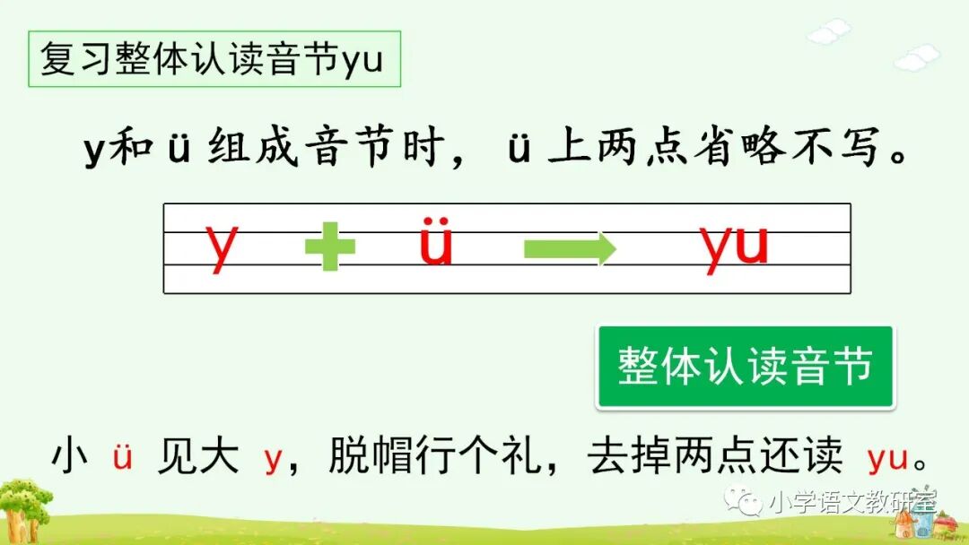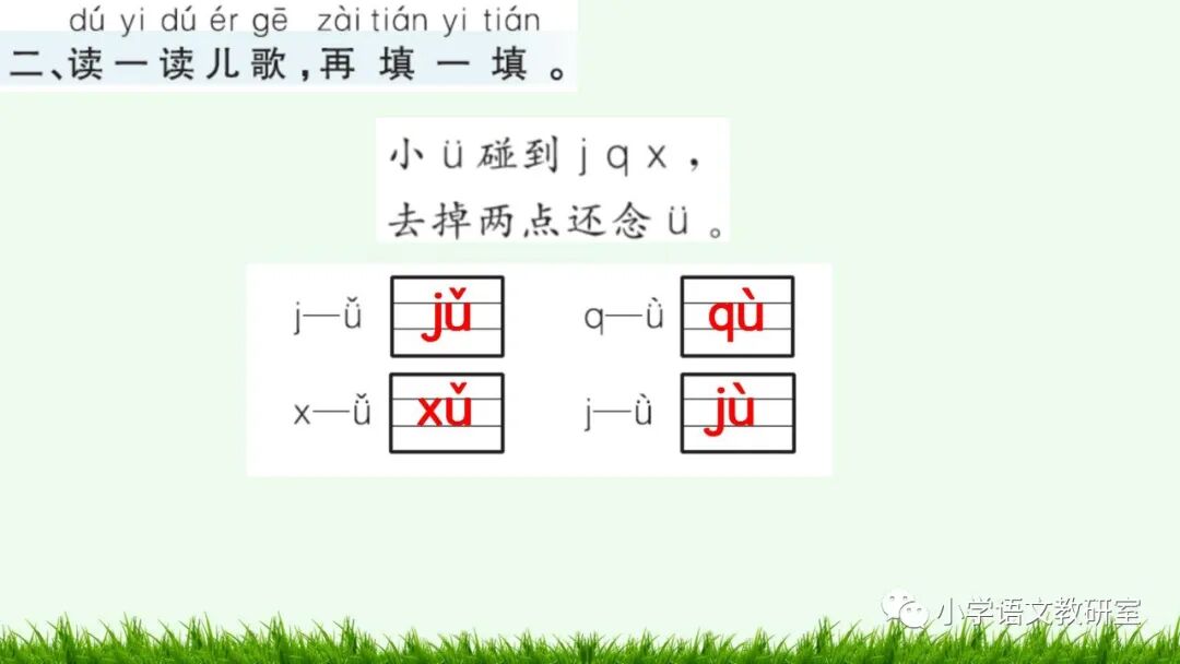 “小 ü 见到 j q x,脱帽行个礼,去掉两点还读 ü ”