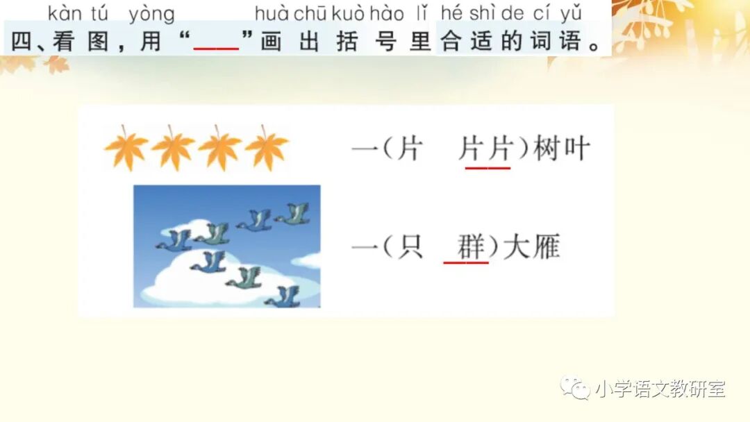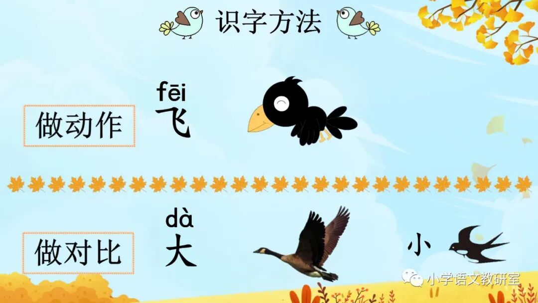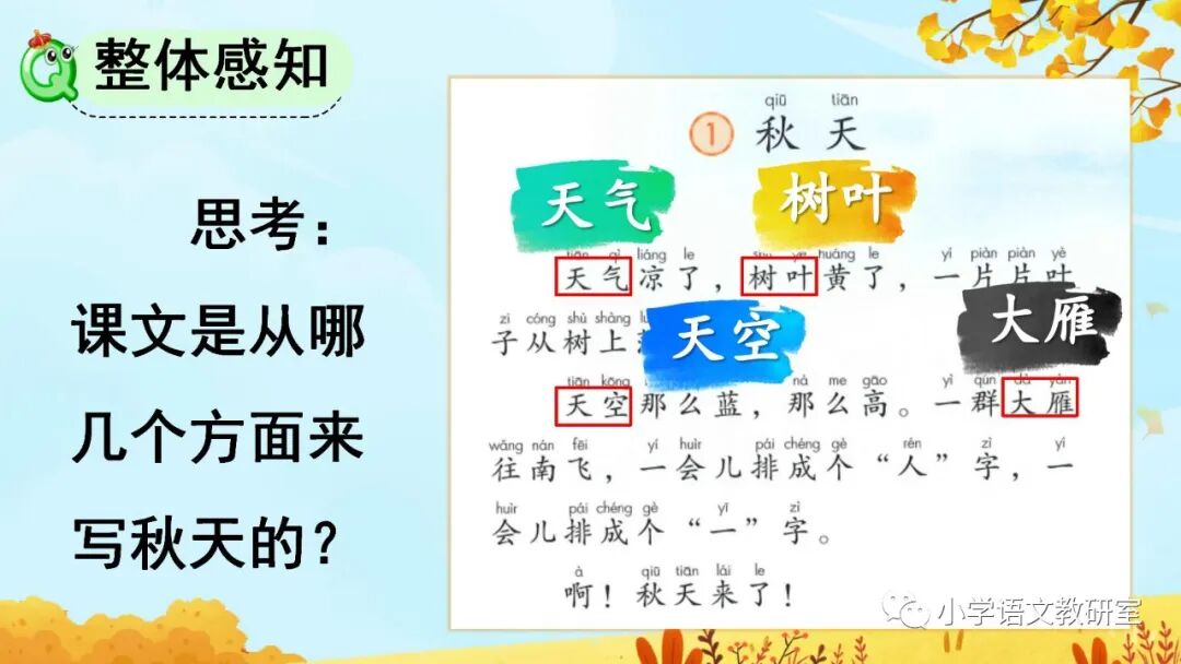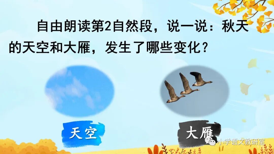 秋天到了,天气凉了,树叶黄了, 一片片叶子从树上落下来,大雁往南飞。