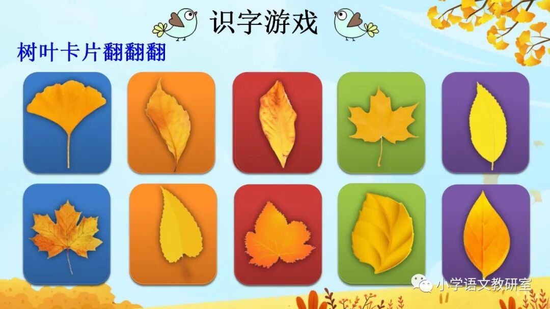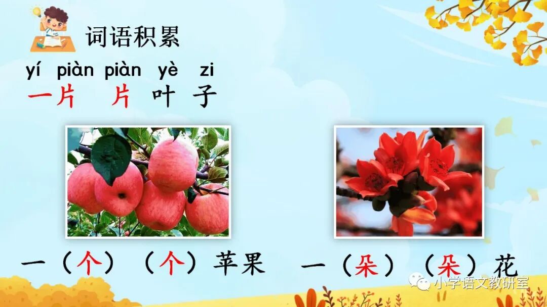1.天气凉了, 树叶黄了,一片片叶子从树上落下来。