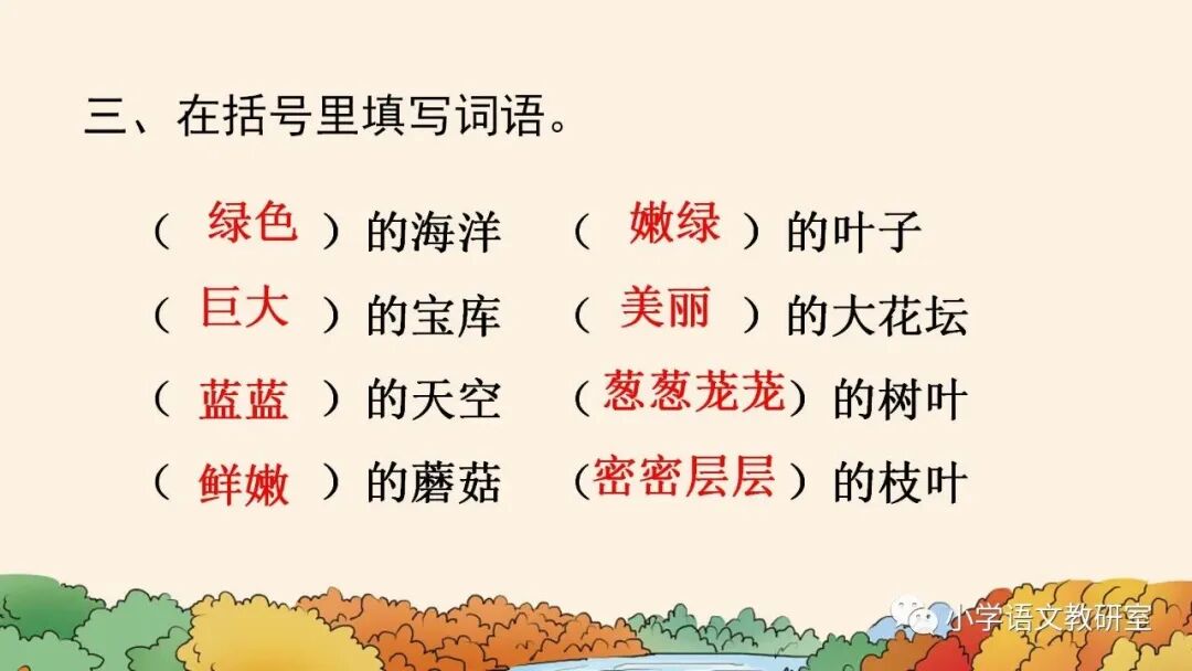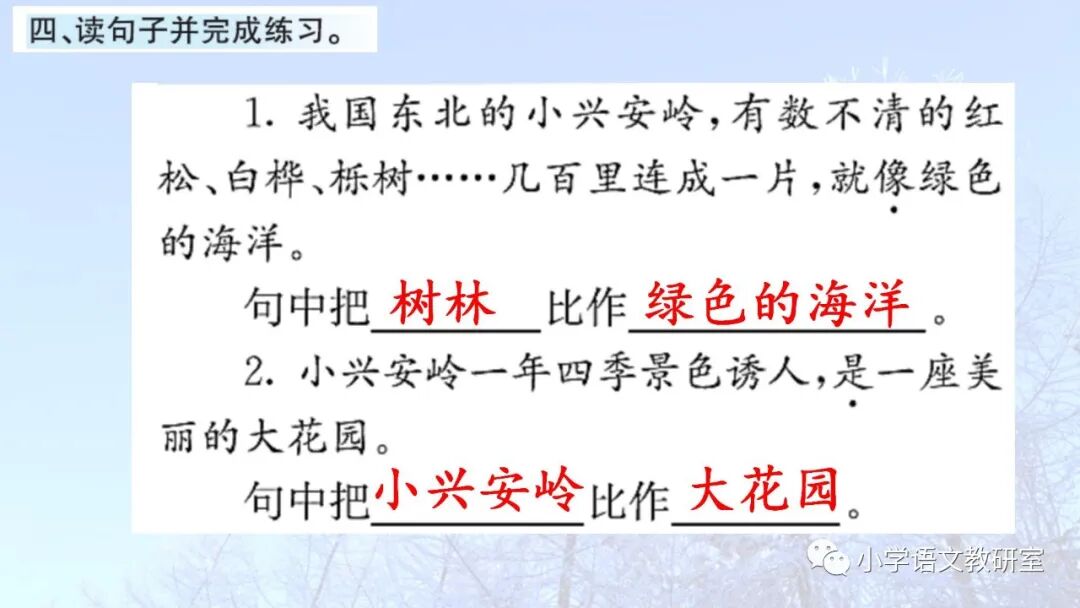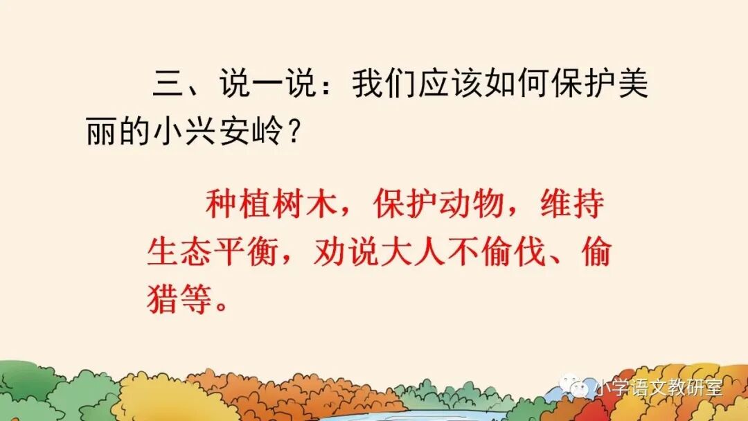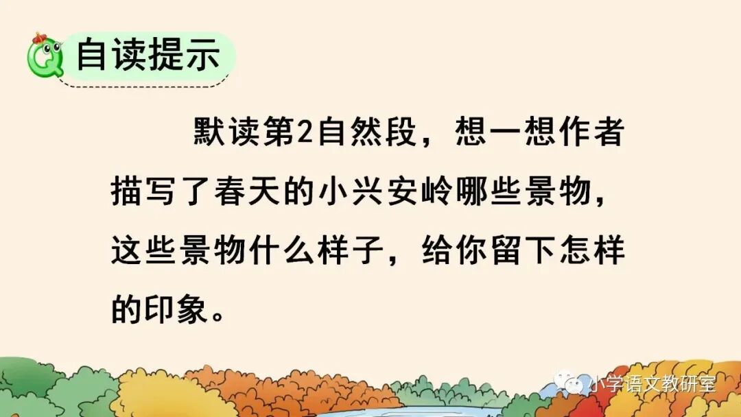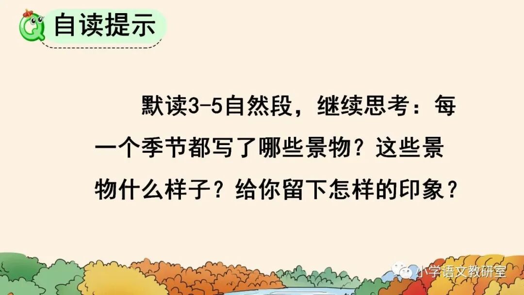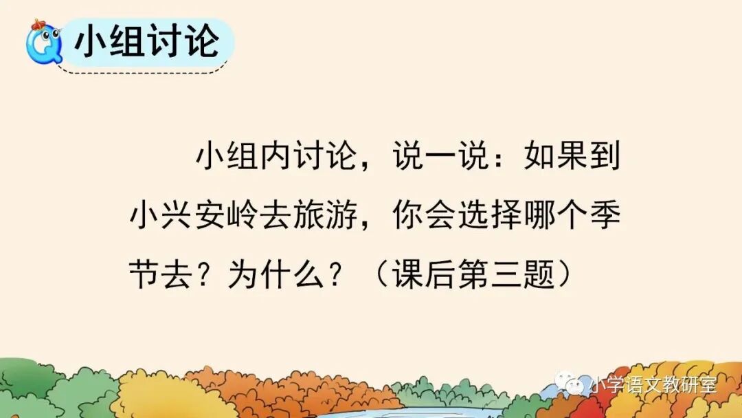 提示:课后第二题是引导理解全文的一道题。它要求学生在获得小兴安岭景色的整体认识的基础上,还要对四季的景色进行比较。这带有个人主观色彩,需要学生分析和思考。要鼓励学生结合自己的体验和感受来谈,说出自己的理由(理由可以是美丽的风景,也可以是物产丰富)。