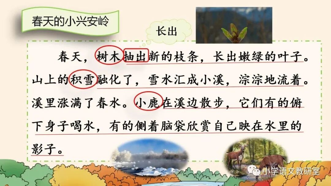 春天,选取“树木”“积雪”“小溪”“小鹿”等景物来描写;