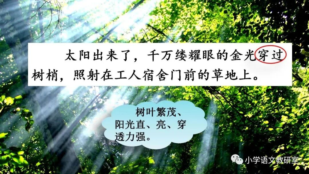 1.太阳出来了,千万缕像利剑一样的金光,穿过树梢,照射在工人宿舍门前的草地上。