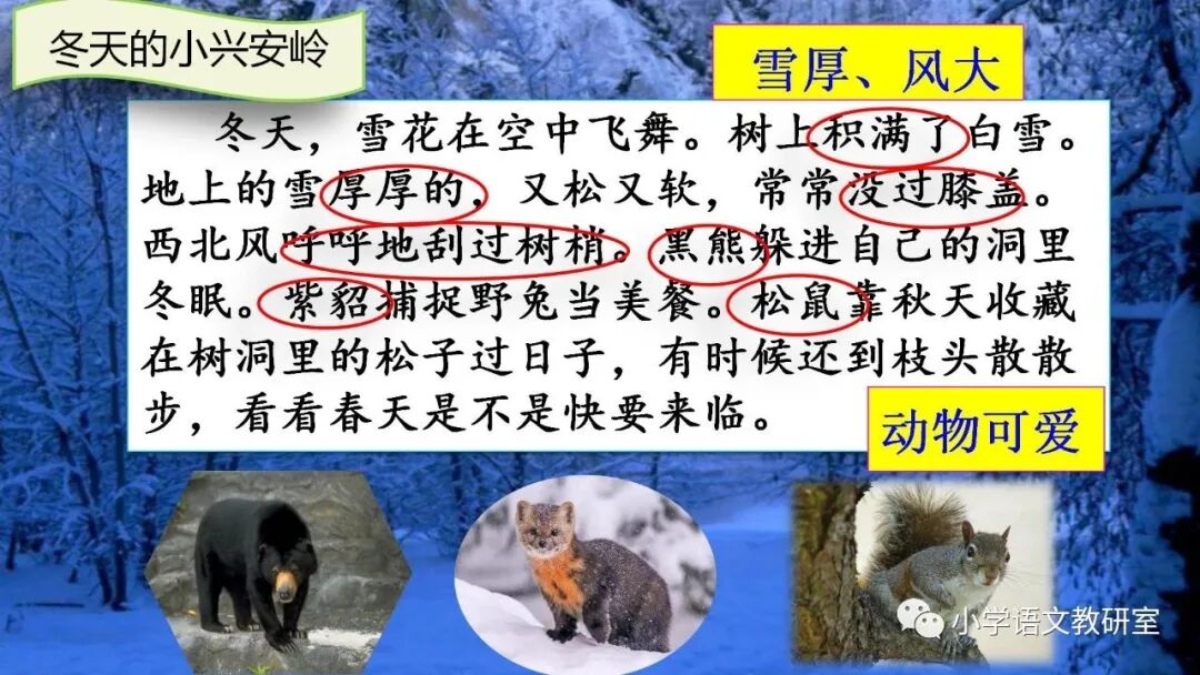冬天,选取“雪花”“树木”“积雪”“西北风”“紫貂”“黑熊”“松鼠”等景物来描写。