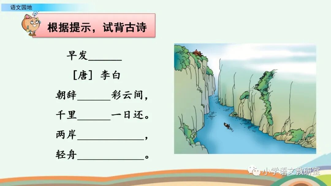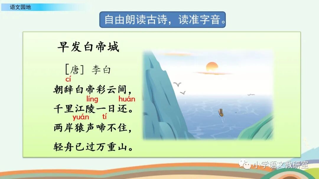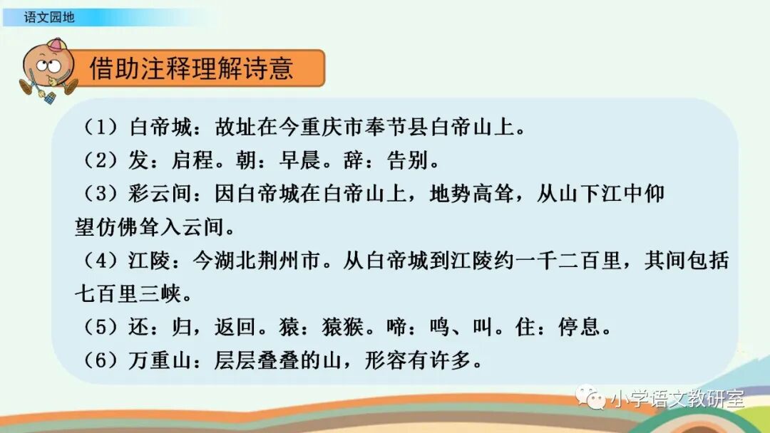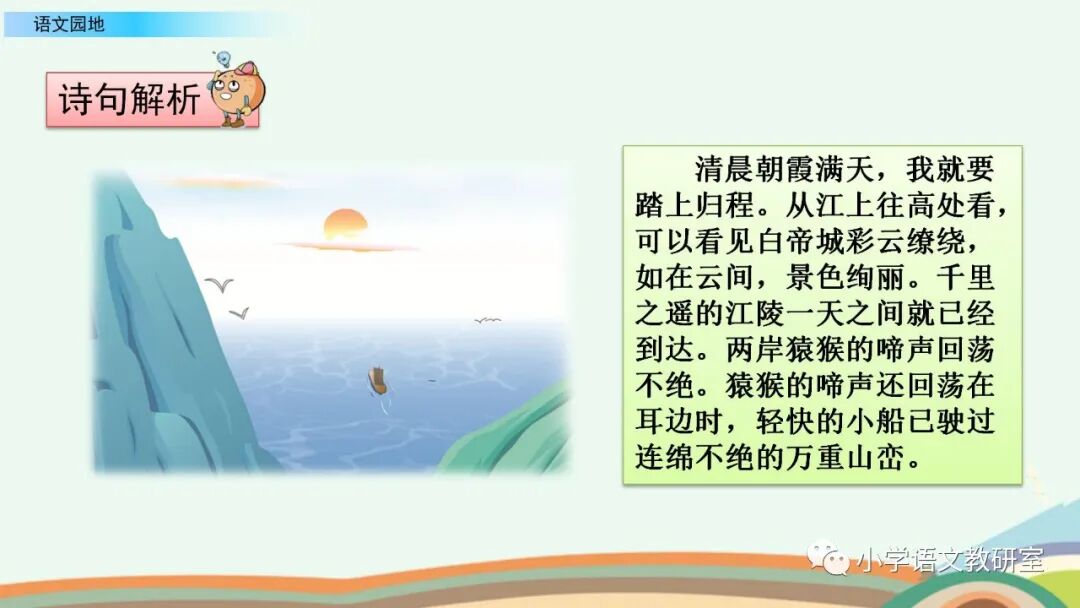 早晨告别朝霞缭绕的白帝城,一日间行程千里回到江陵。两耳边仍然响着沿岸猿叫声,轻轻的船儿早已越过千山万岭。黎明,为我送行,彩云,笼罩着白帝城,一叶轻快的小舟,会把我带到千里外的江陵,两岸的猿猴,不停地啼叫,小舟载着我的欢快,越过了重重高山,重重险岭。