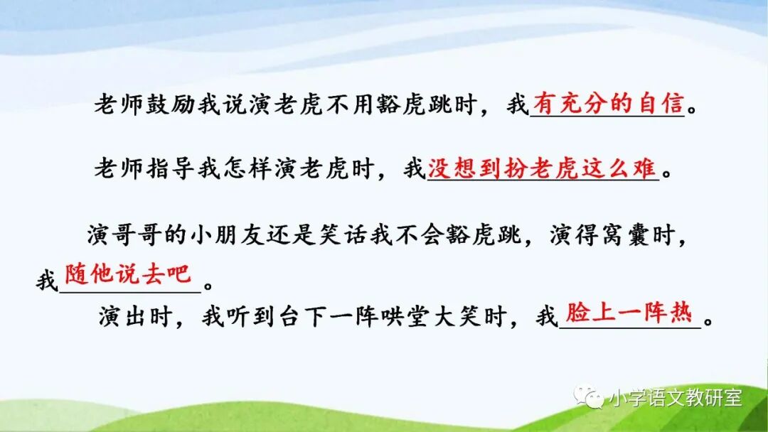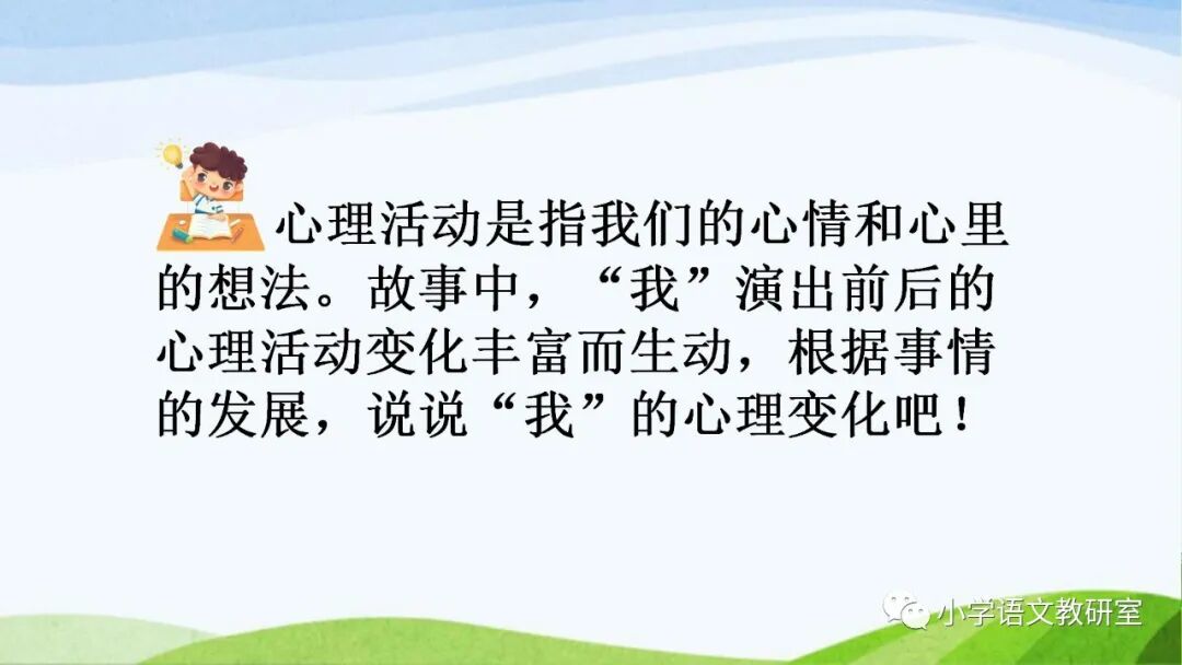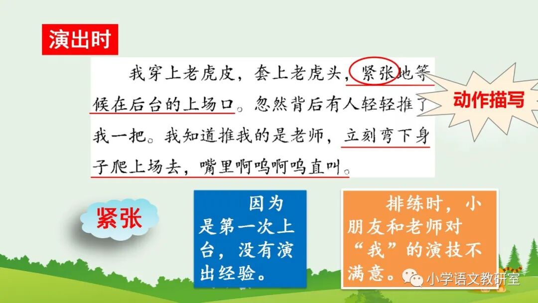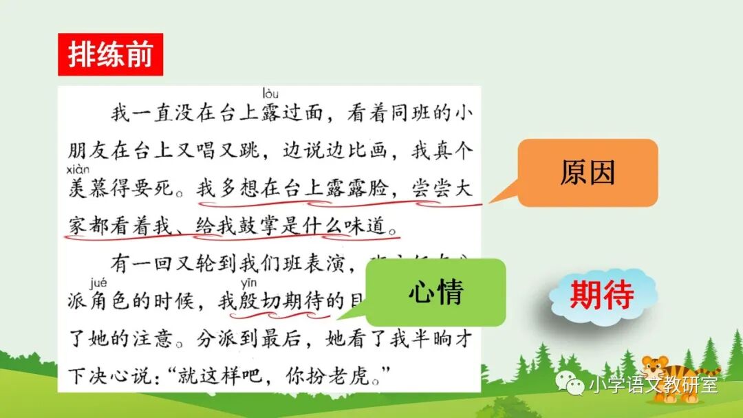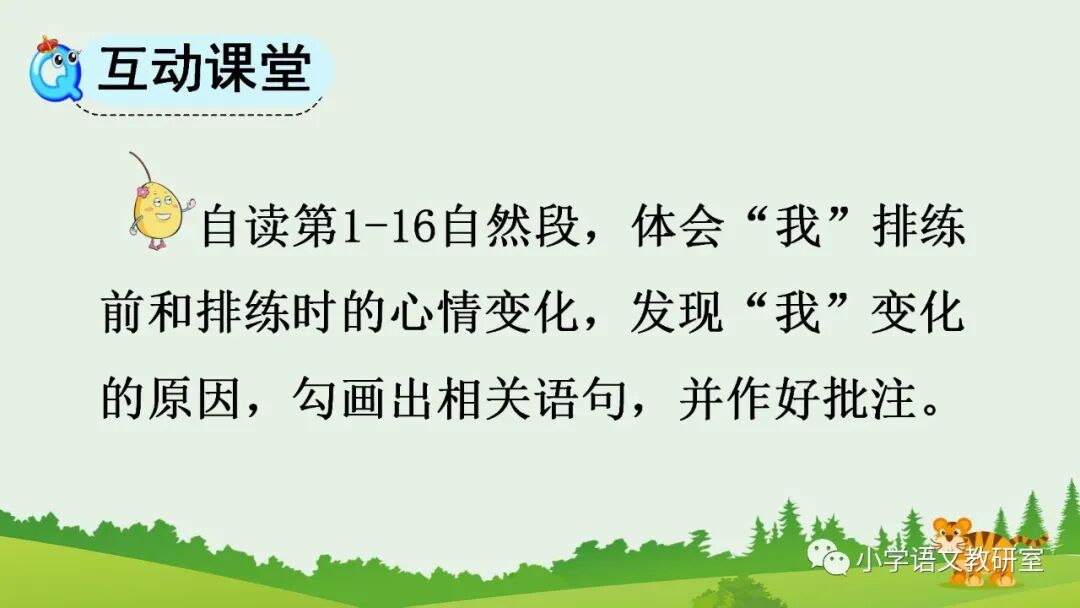 2、结合文中描写“我”动作、神态、语言的语句,说说在排练节目和演出时,“我”的心情有怎样的变化,为什么会有那样的变化?并填写下面的表格。