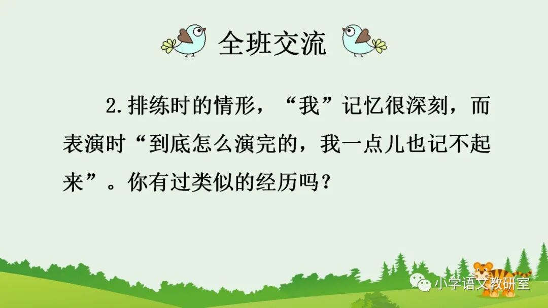 排练时的情形,“我”记忆很深刻,而表演时“到底怎么演完的,我一点儿也记不起来”。你有过类似的经历吗?印象最深的是什么,和同学交流。