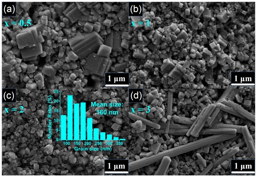 图2. KNN-Sm-x陶瓷的自然表面SEM图:(a) x = 0.5, (b) x = 1, (c) x = 2, (d) x = 3以及 x = 2 陶瓷样品的晶粒分布图(c的插图)