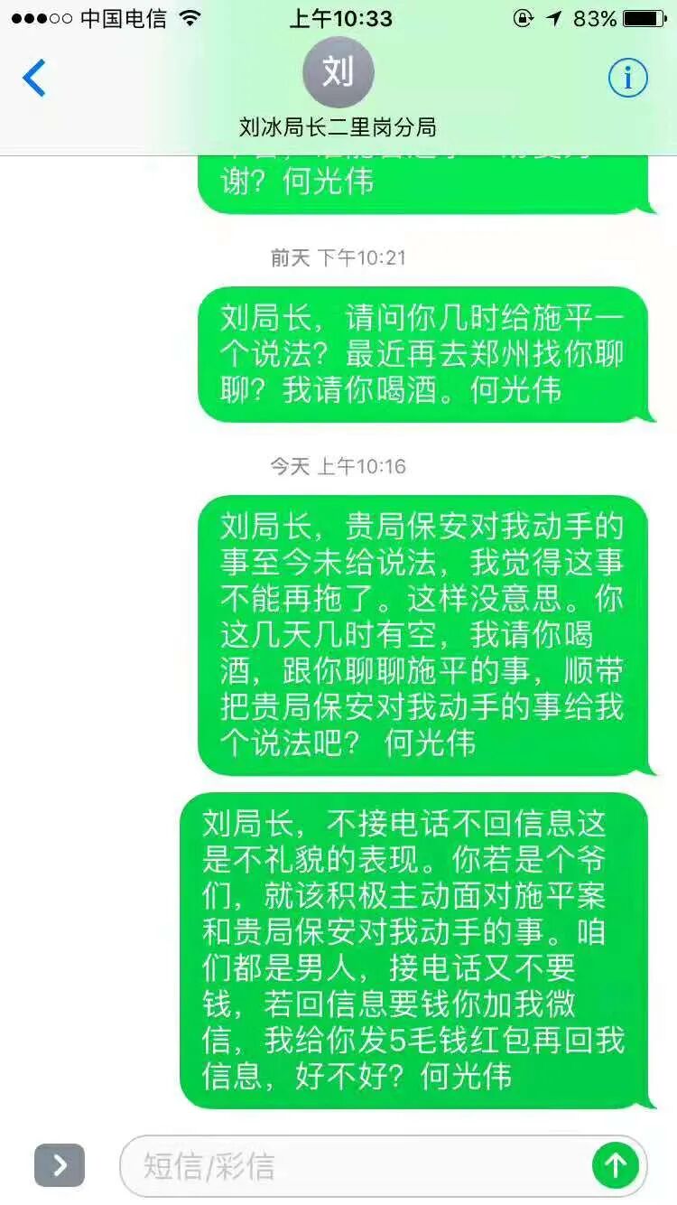 中间我给刘冰局长仅仅发过几次信息,刘冰局长竟然直接拉黑我。