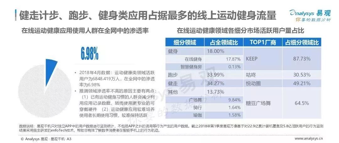根据易观的数据,2018年线上运动领域活跃用户在全网中的渗透率仅为6.98%,不仅要拉新,还要与其他APP竞争存量用户。