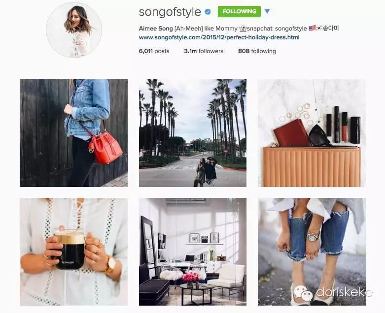 再打个比方,著名的韩裔时尚博主宋阿妹,Aimee Song (@Songofstyle),也是拥有非常干净、高雅又美观的instagram