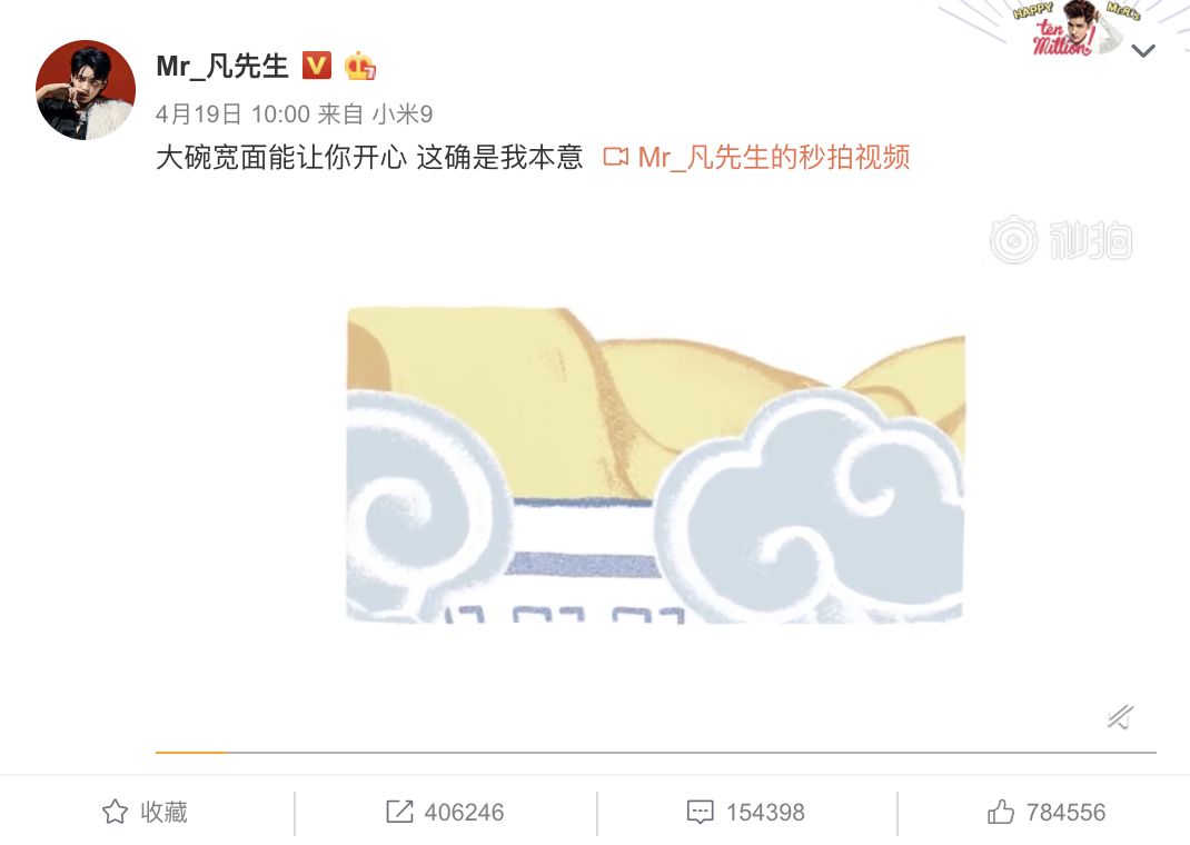 ……就在这时,群民嘲笑蔡徐坤热火朝天的2019年4月19日,吴亦凡新歌《大碗宽面》上线,他发了一条微博配文:“大碗宽面能让你开心,这确是我本意。”