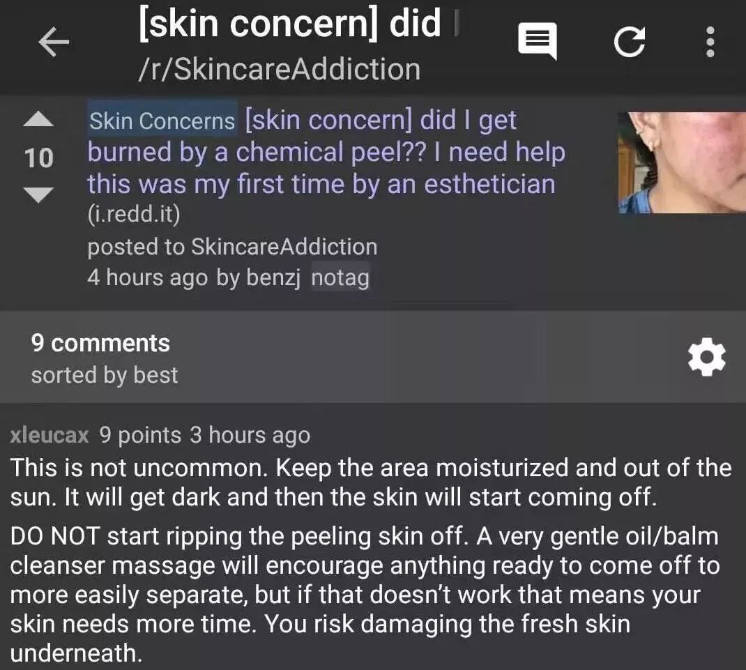 图:Reddit上的讨论,关于脱皮和是否要使用酸类护肤品