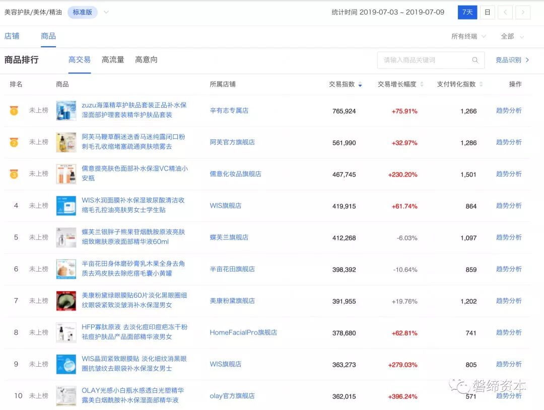 图:7/3-7/9日间,淘系销售前十的美容护肤类产品,名字中不乏VC,玻尿酸,寡肽和烟酰胺这些成分