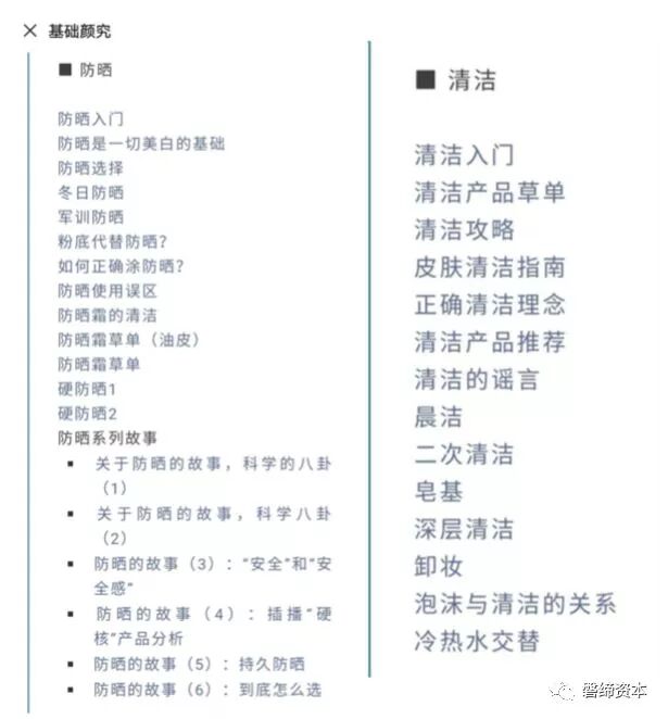 长年话题积累已经让他的内容做到了非常细分,比如光是防晒专题,就包括了防晒入门、冬日防晒、军训防晒等。
