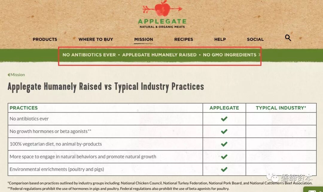 比如一家肉类食品公司Applegate,他们的宗旨就是提供「无抗生素、非转基因」的成分。