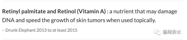 图:Drunk Elephant声称棕榈酸视黄酯和A醇(维生素A)可能会损害DNA,加速皮肤肿瘤的生长。