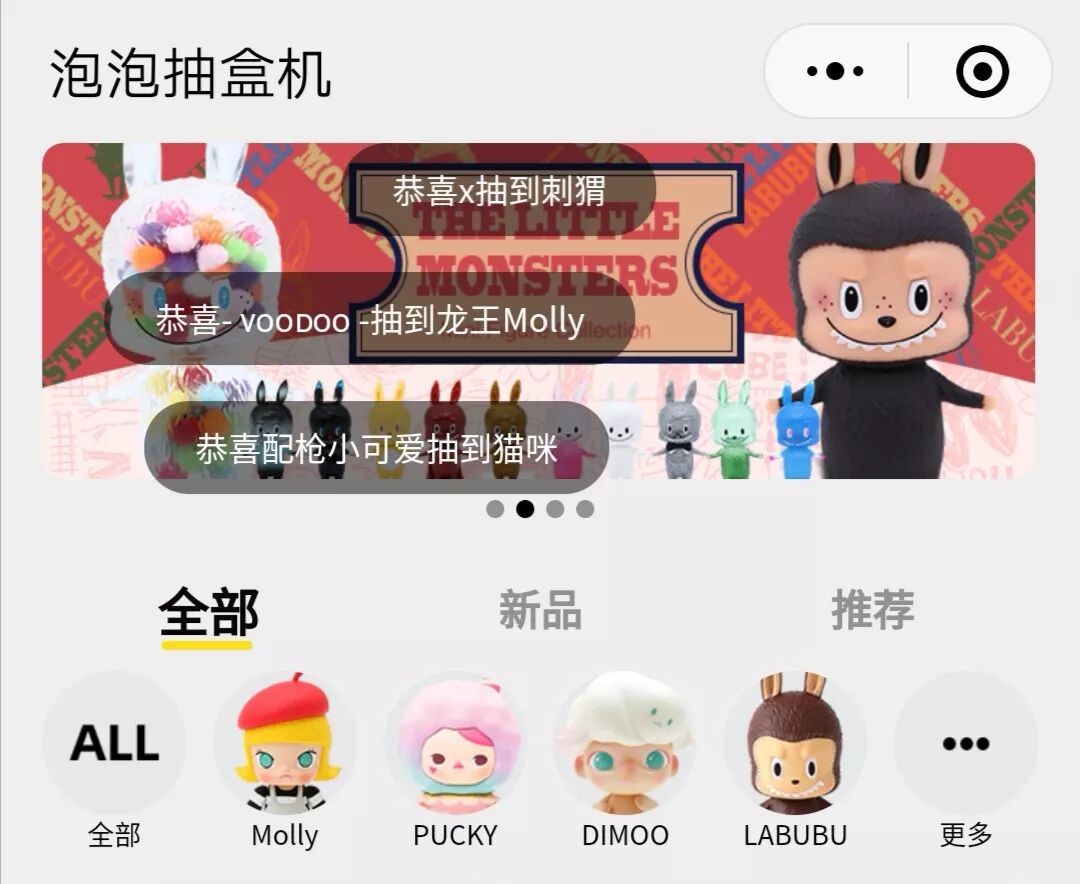 能,泡泡玛特的解决方案是线上小程序。在这个泡泡抽盒机里购买,可以立即拆盒(验证欧皇和非酋),极大程度上刺激用户,目前小程序的复购率能达到80%以上(不包含当天复购)。