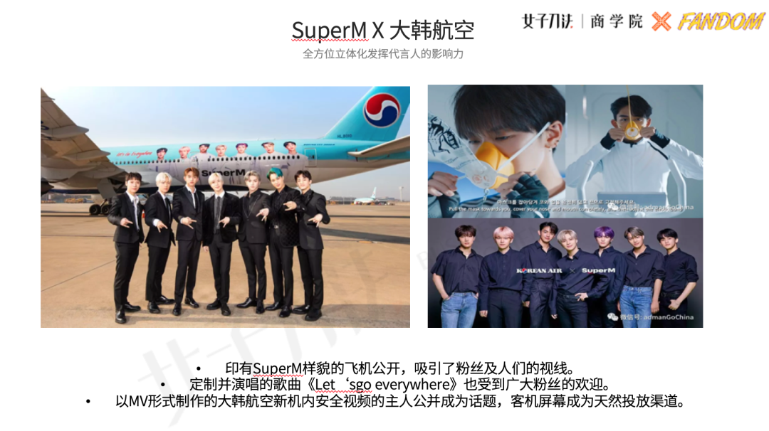 举个例子,大韩航空和SUPERM合作过一系列爆火的视频。它们不仅把成员的整个形象直接印在飞机上,还让他们拍了一系列安全宣传片,给粉丝营造了很强的真实感。