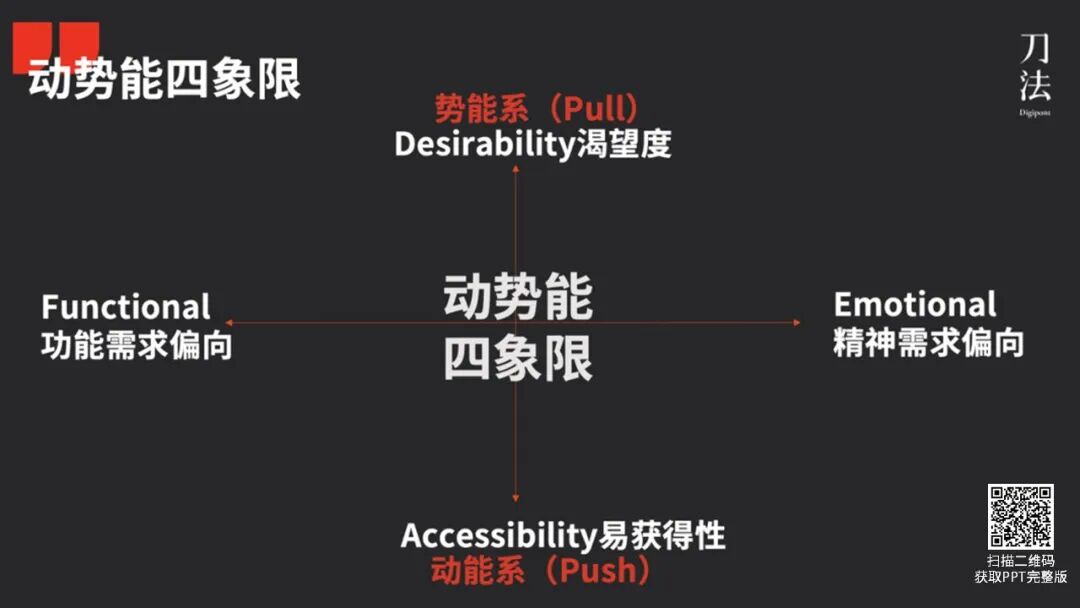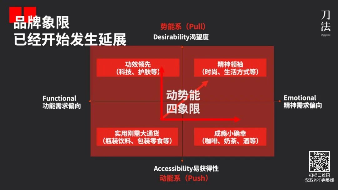 经过这样一番思考后,围绕品牌的易获得性 vs 渴望度、功能需求偏向 vs 精神需求偏向,我升级迭代了「动势能品牌模型 2.0——动势能四象限」。