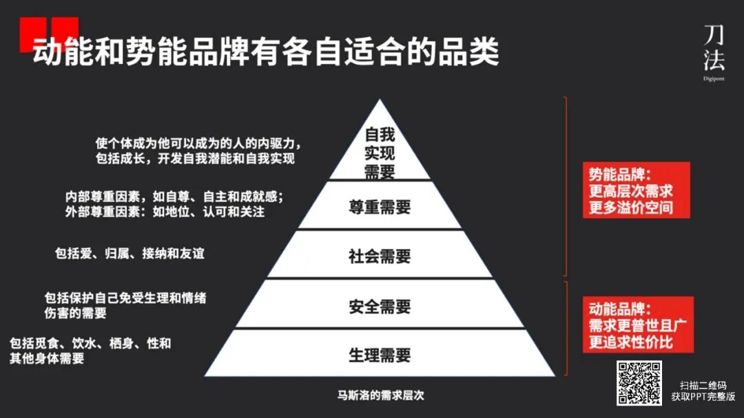 这四个品牌类目,各自对应着人的 5 大基础需求的满足,也就是马斯洛的需求层次理论,从基础的生理、安全需求,往自我实现需求一步步迁移上升。