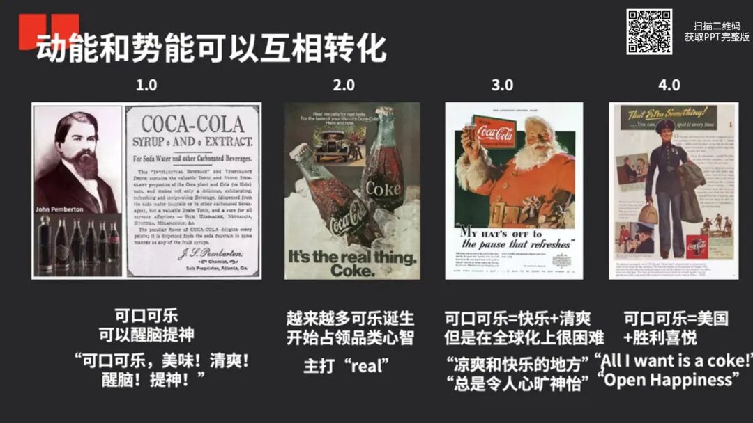 套用「动势能四象限」,可口可乐百年来一直在这 4 个象限中迁移,今天我们搜可口可乐slogan,会发现它仍旧在这 4 个象限中不停的跳来跳去。