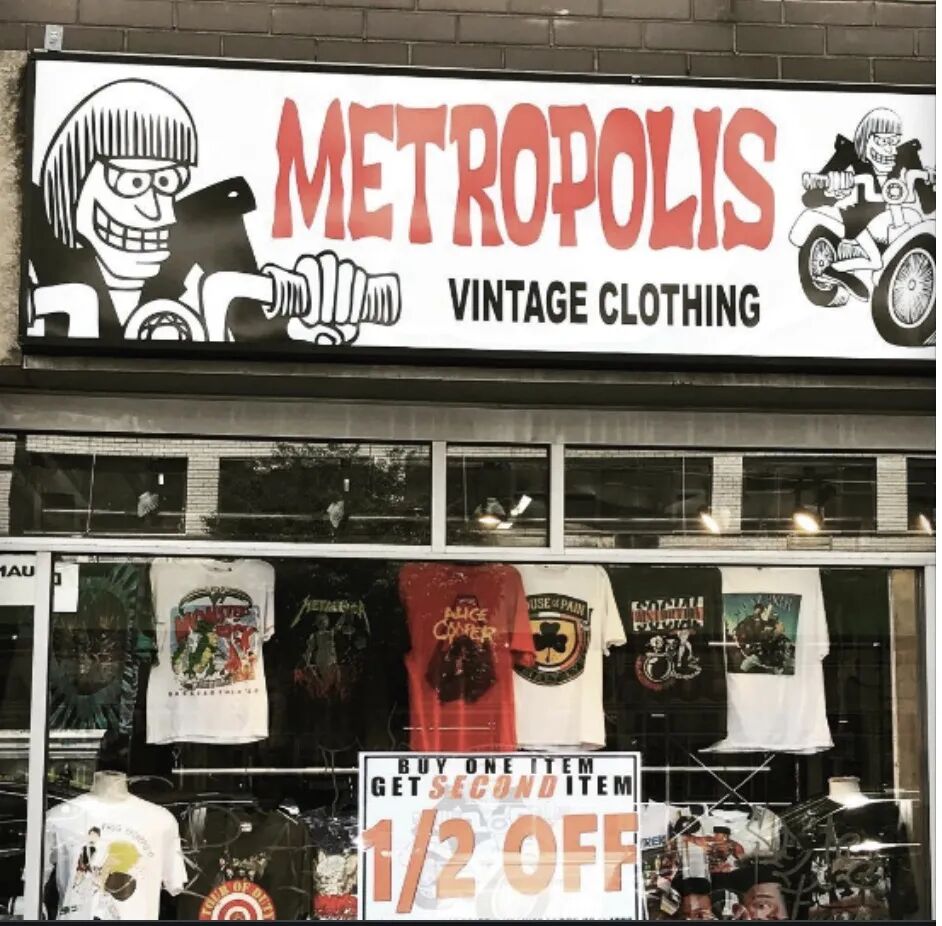 纽约的 Metropolis Vintage,这家经营了 40 多年的老店有着纽约最多的 Vintage 短袖,店家把它们按照年代、⻛格、音乐类型、电影类型等整⻬划分开来,不开玩笑你可以在这里逛上一整天。店主曾和我聊天时介绍说 Kanye West, Kim Kardashian, Rihanna, ASAP Rocky 基本每次到纽约都会来他们店淘一两个小时,这些名人当发现一件吸引他们但售价仅几十刀的短袖时也会激动的大喊大叫起来。有机会去纽约的朋友们一定要去逛逛!
