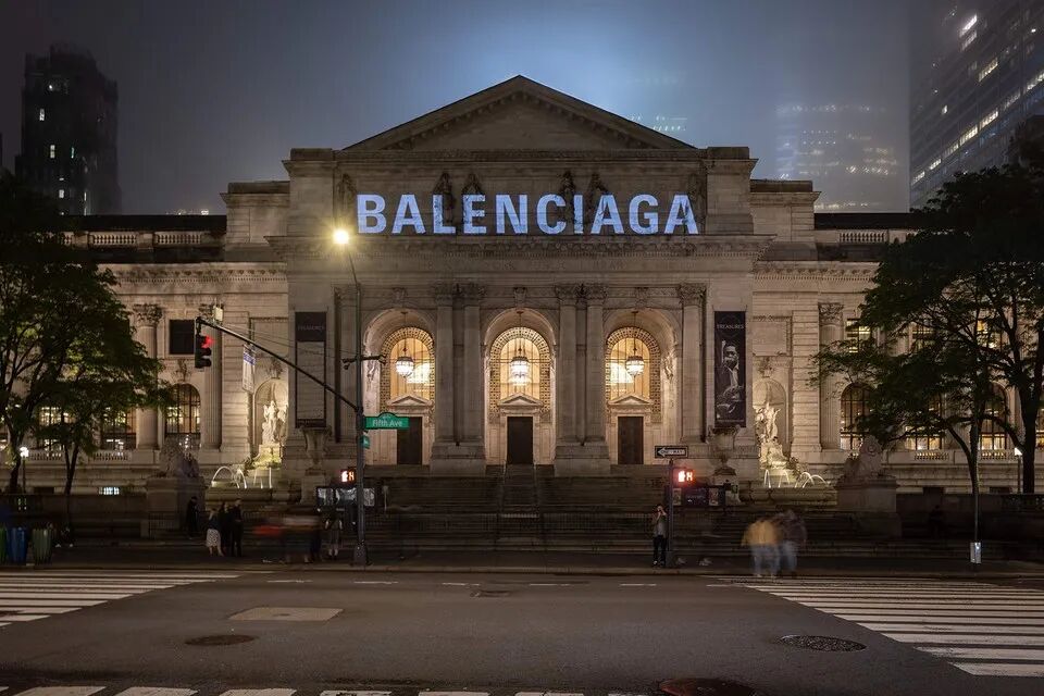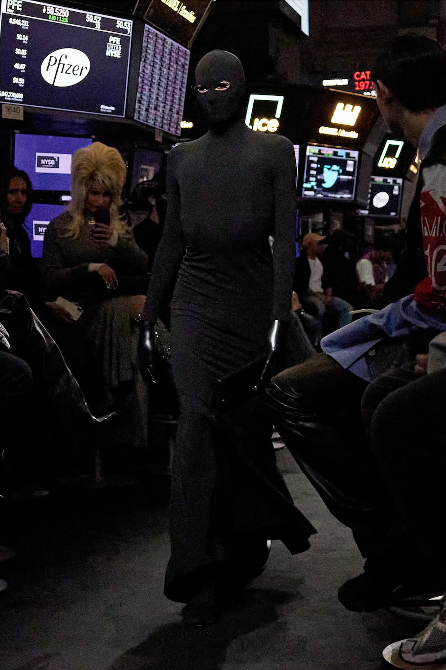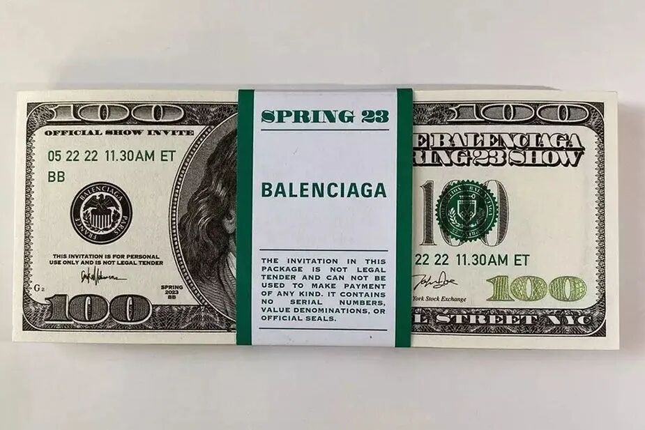 作为新古典主义代表建筑的纽约证券交易所坐落于金融中心华尔街之上,场所的选定似乎向关注者们提早揭示了本场秀的主题。几周之前,Balenciaga 以仿制的美元现金形式发出观秀邀请函,还将品牌标志投射到纽约的多处标志性建筑上造势,让这场大秀在开始之前便备受期待。
